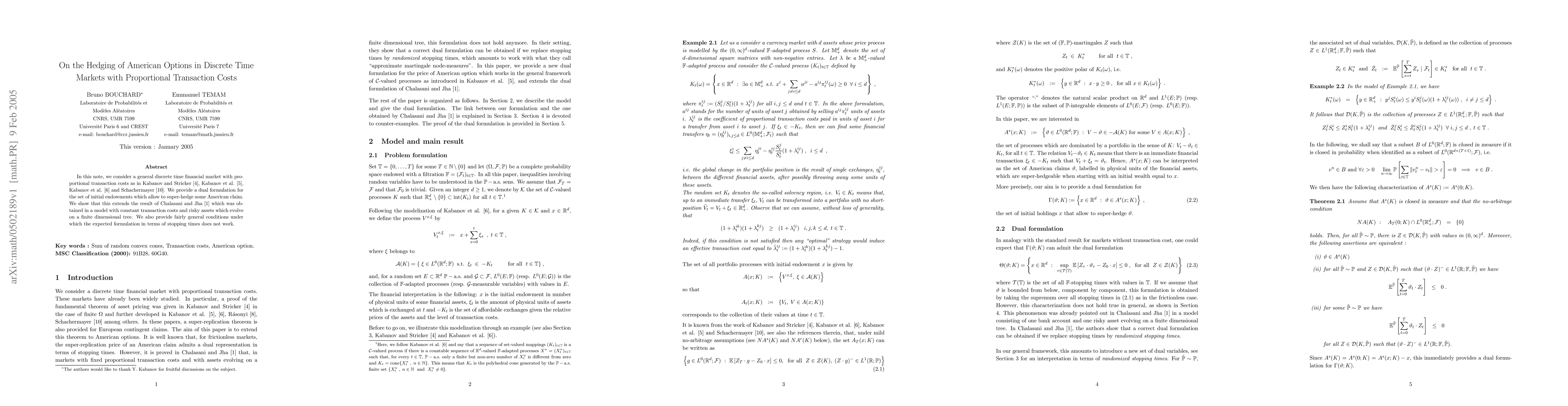 This paper studies how to hedge American options in discrete time markets with proportional transaction costs, extending previous results on constant transaction costs. It provides conditions under which the expected formulation using stopping times fails.