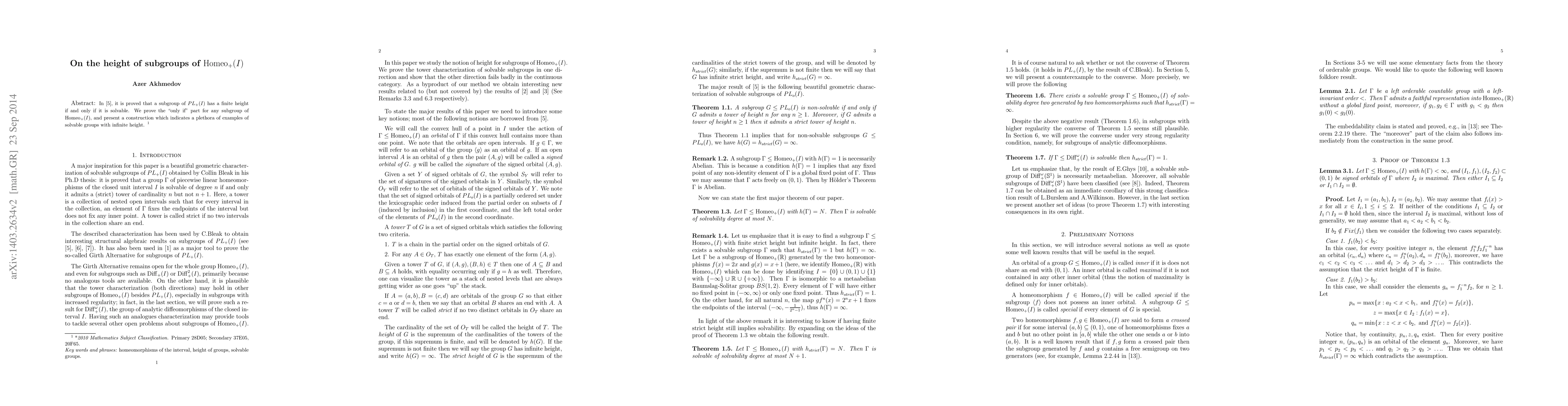 This paper proves the 'only if' part of a statement that subgroups of Homeo(I) with finite height are solvable, and provides a construction for infinitely many height solvable groups.