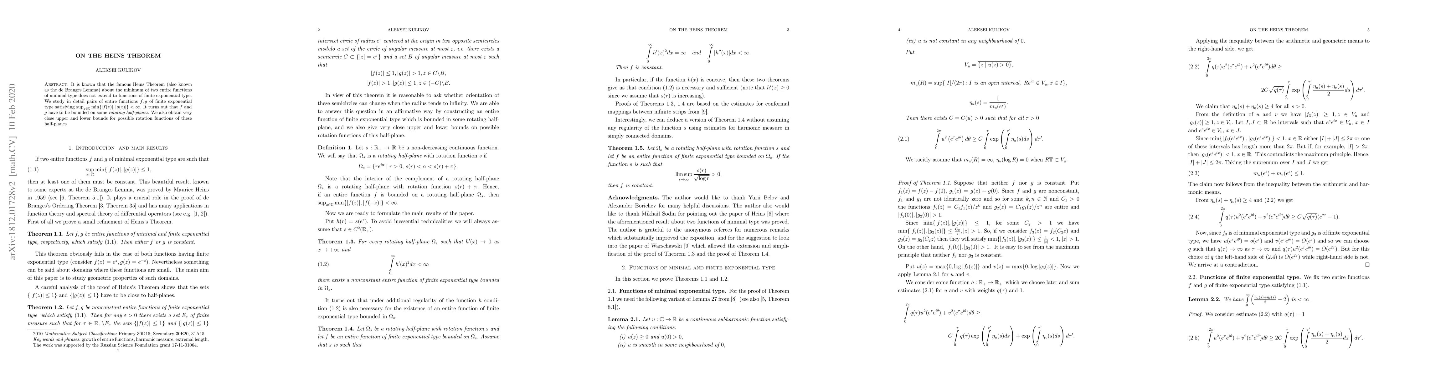 It is known that the famous Heins Theorem (also known as the de Branges Lemma) about the minimum of two entire functions of minimal type does not extend to functions of finite exponential type. We study in detail pairs of entire functions $f, g$ of finite exponential type satisfying $\sup_{z\in\mathbb{C}}\min\{|f(z)|,|g(z)|\}<\infty.$ It turns out that $f$ and $g$ have to be bounded on some rotating half-planes. We also obtain very close upper and lower bounds for possible rotation functions of these half-planes.