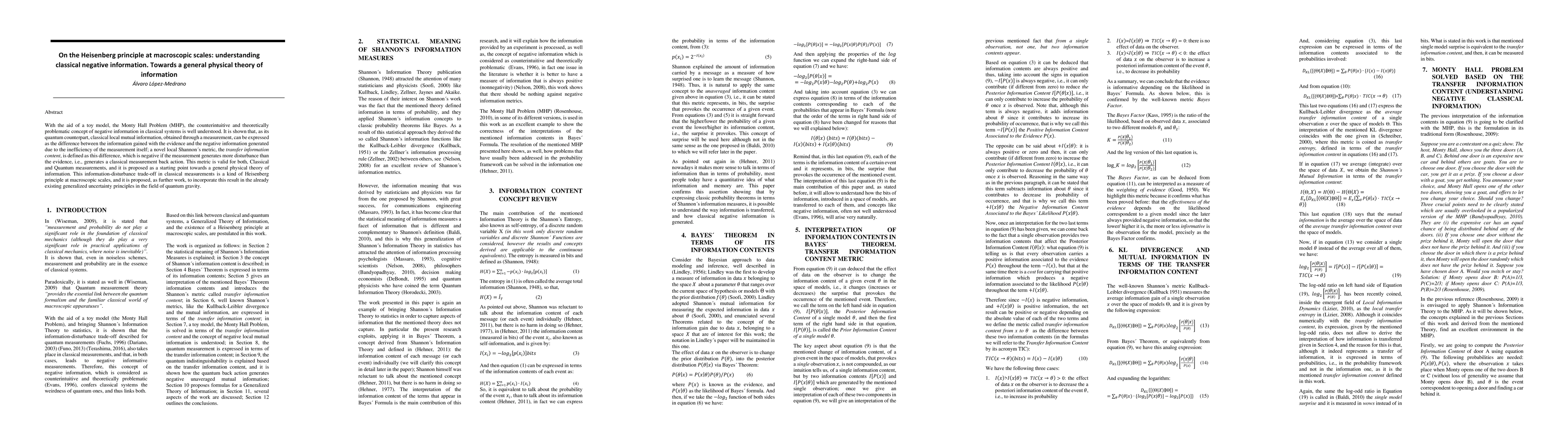 With the aid of a toy model, the Monty Hall Problem (MHP), the counterintuitive and theoretically problematic concept of negative information in classical systems is well understood. It is shown that, as its quantum counterpart, classical local mutual information, obtained through a measurement, can be expressed as the difference between the information gained with the evidence and the negative information generated due to the inefficiency of the measurement itself; a novel local Shannon metric, the transfer information content, is defined as this difference, which is negative if the measurement generates more disturbance than the evidence, i.e., generates a classical measurement back action. This metric is valid for both, Classical and Quantum measurements, and it is proposed as a starting point towards a general physical theory of information. This information-disturbance trade-off in classical measurements is a kind of Heisenberg principle at macroscopic scales, and it is proposed, as further work, to incorporate this result in the already existing generalized uncertainty principles in the field of quantum gravity.