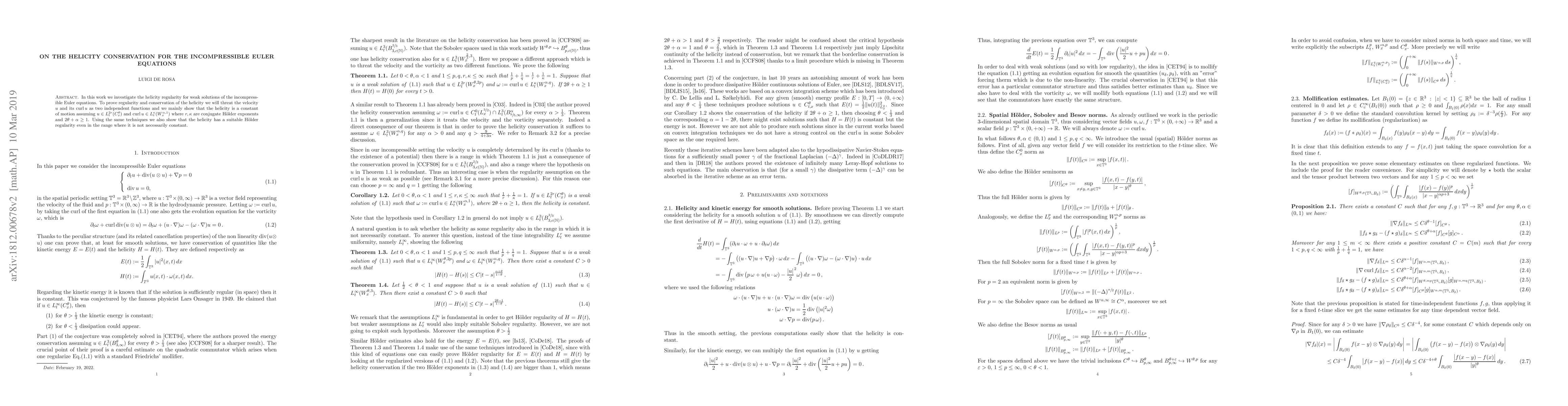 In this work we investigate the helicity regularity for weak solutions of the incompressible Euler equations. To prove regularity and conservation of the helicity we will threat the velocity $u$ and its $curl\, u$ as two independent functions and we mainly show that the helicity is a constant of motion assuming $u \in L^{2r}_t(C^\theta_x)$ and $curl \,u \in L^{\kappa}_t(W^{\alpha,1}_x)$ where $r,\kappa $ are conjugate H\"older exponents and $2\theta+\alpha \geq 1$. Using the same techniques we also show that the helicity has a suitable H\"older regularity even in the range where it is not necessarily constant.