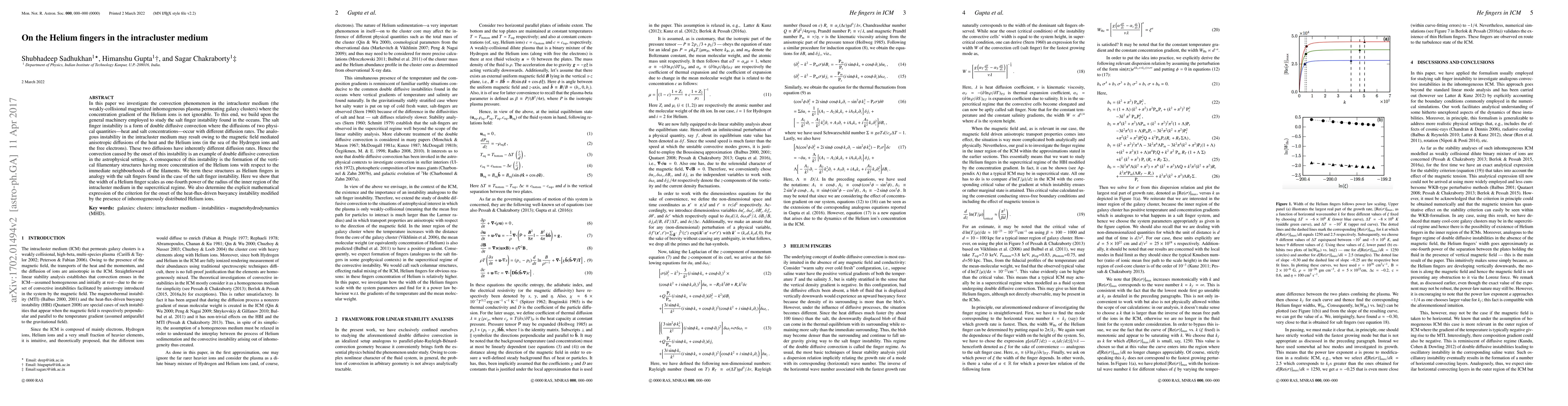 This paper explores convection in the intracluster medium driven by the anisotropic diffusion of heat and Helium ions, analogous to the salt finger instability in oceans. It identifies vertical filamentary structures, termed Helium fingers, resulting from this double diffusive convection, and provides a mathematical criterion for their onset.