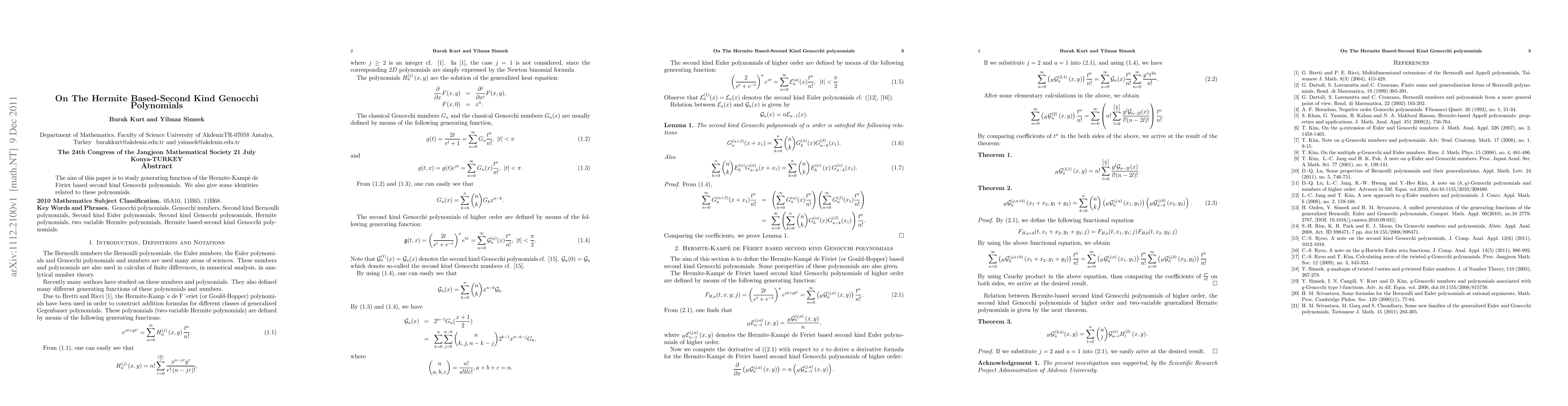 This paper investigates the generating function of Hermite-Kampè de Fériet based second kind Genocchi polynomials and presents associated identities related to these mathematical constructs.