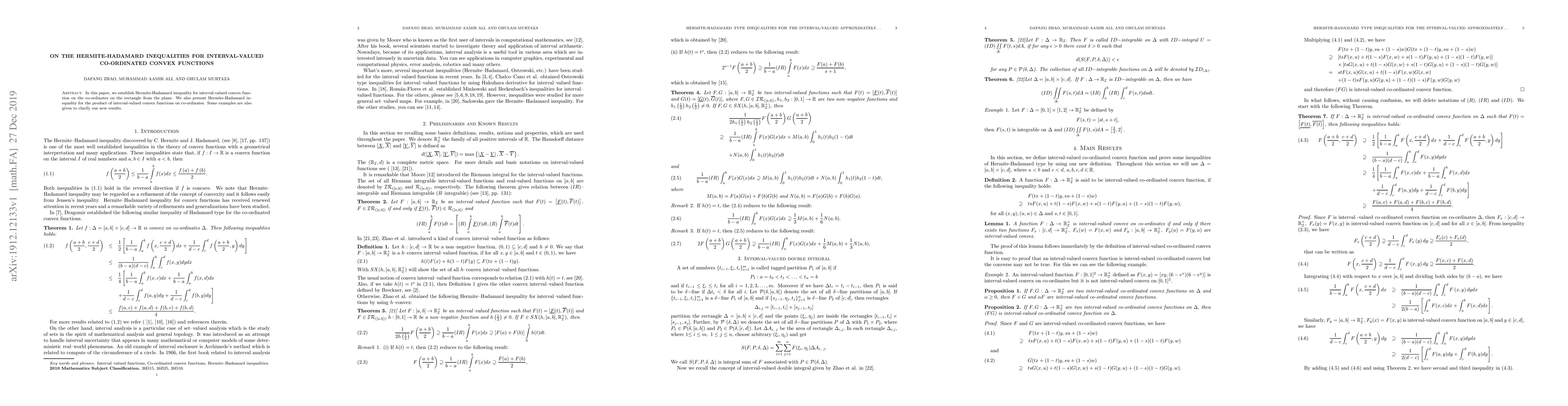 In this paper, we establish Hermite-Hadamard inequality for interval-valued convex function on the co-ordinates on the rectangle from the plane. We also present Hermite-Hadamard inequality for the product of interval-valued convex functions on co-ordinates. Some examples are also given to clarify our new results