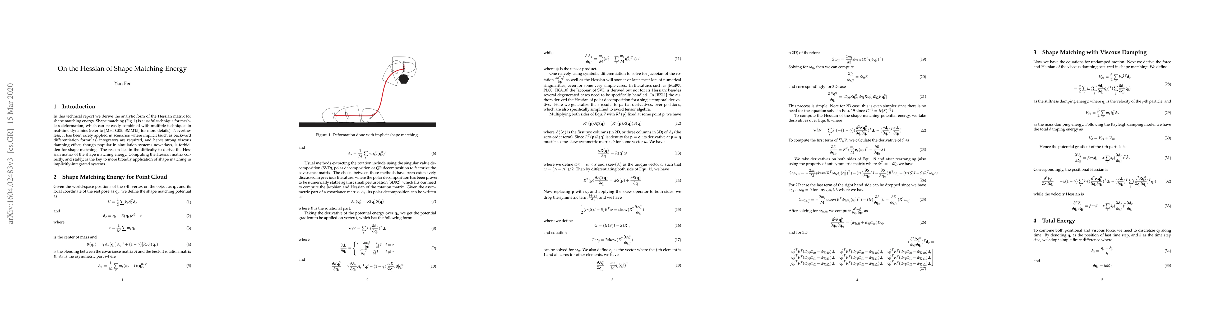 This paper derives the analytic form of the Hessian matrix for shape matching energy, crucial for meshless deformation in real-time dynamics. It addresses the challenge of applying shape matching in implicitly-integrated systems, emphasizing the importance of accurately computing the Hessian for broader use.
