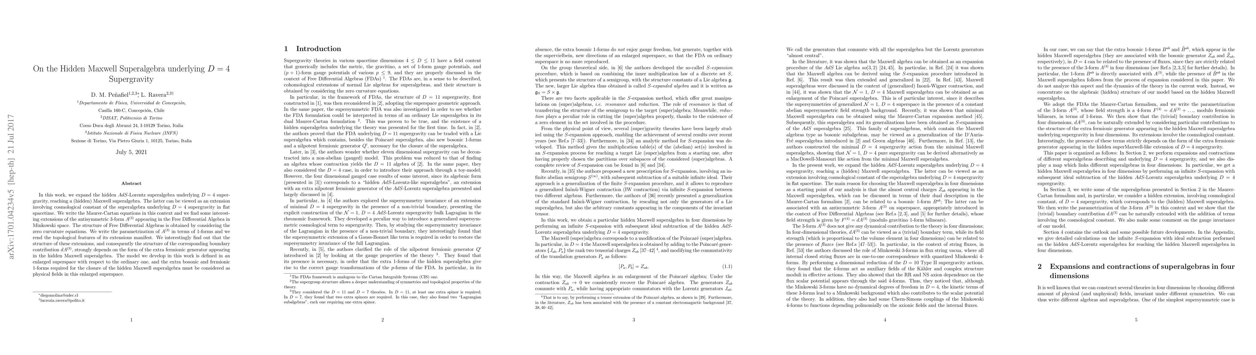 This paper explores the hidden Maxwell superalgebra underlying $D=4$ supergravity, extending it to include an $AdS$-Lorentz superalgebra. The study reveals the structure of Free Differential Algebras and the topological features of extensions of the $3$-form $A^{(3)}$, showing that these depend on an extra fermionic generator in the hidden Maxwell superalgebra.