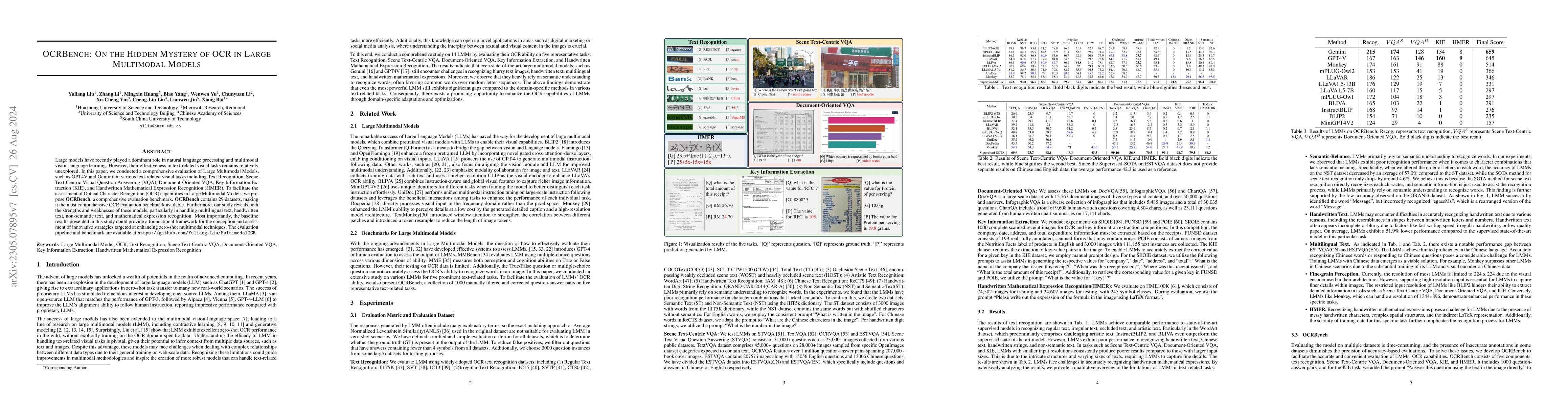 This paper evaluates Large Multimodal Models in text-related visual tasks using OCRBench, a comprehensive benchmark with 29 datasets. It reveals the models' strengths and weaknesses in multilingual, handwritten, and mathematical text recognition, providing a foundational framework for future enhancements.
