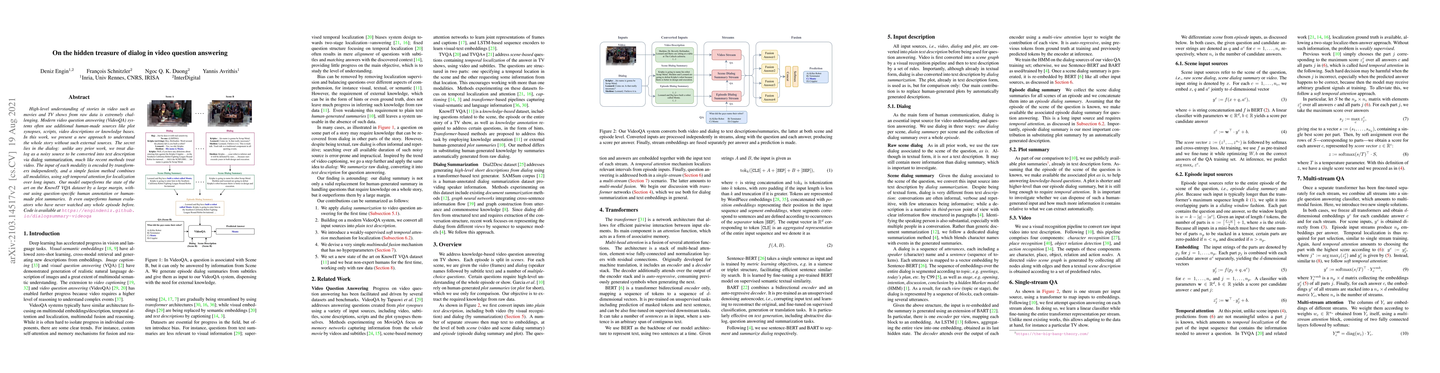 High-level understanding of stories in video such as movies and TV shows from raw data is extremely challenging. Modern video question answering (VideoQA) systems often use additional human-made sources like plot synopses, scripts, video descriptions or knowledge bases. In this work, we present a new approach to understand the whole story without such external sources. The secret lies in the dialog: unlike any prior work, we treat dialog as a noisy source to be converted into text description via dialog summarization, much like recent methods treat video. The input of each modality is encoded by transformers independently, and a simple fusion method combines all modalities, using soft temporal attention for localization over long inputs. Our model outperforms the state of the art on the KnowIT VQA dataset by a large margin, without using question-specific human annotation or human-made plot summaries. It even outperforms human evaluators who have never watched any whole episode before. Code is available at https://engindeniz.github.io/dialogsummary-videoqa