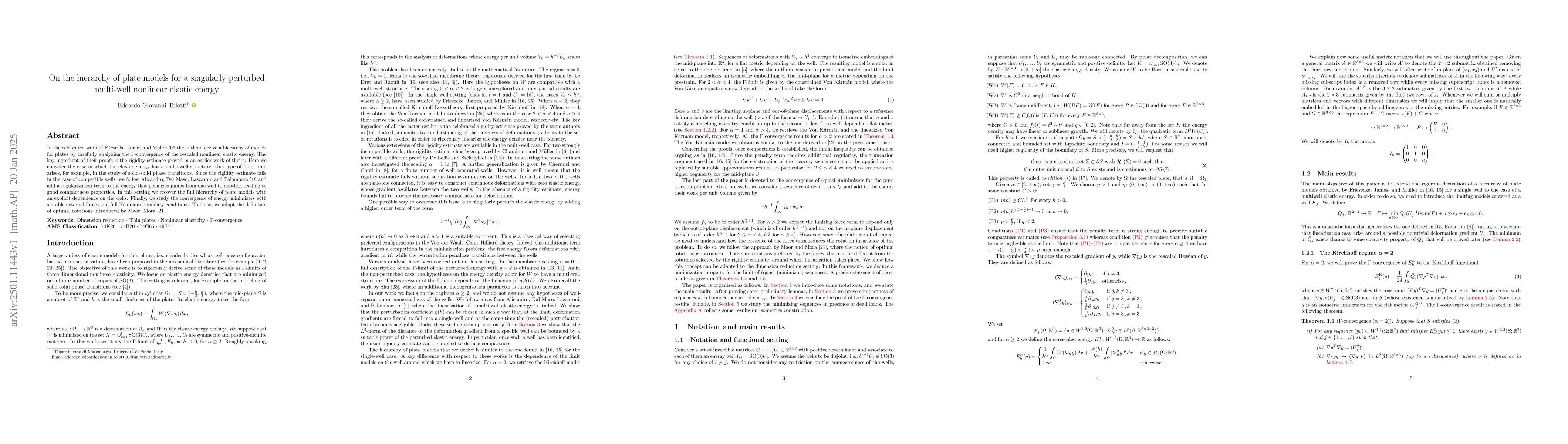 This paper develops a hierarchy of plate models for nonlinear elastic energy with a multi-well structure by adding a regularization term to address the failure of the rigidity estimate. It recovers the full hierarchy of plate models and studies the convergence of energy minimizers under external forces.