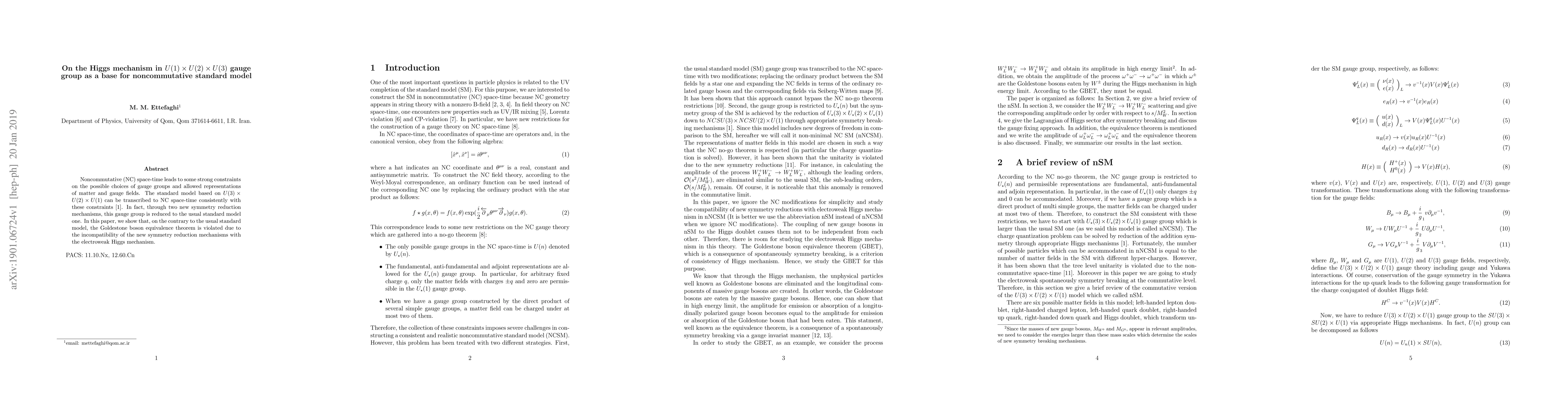 This paper explores the Higgs mechanism in a $U(1) imes U(2) imes U(3)$ gauge group within noncommutative space-time, reducing to the standard model via new symmetry mechanisms. It reveals a violation of the Goldstone boson equivalence theorem due to incompatibility with the electroweak Higgs mechanism.