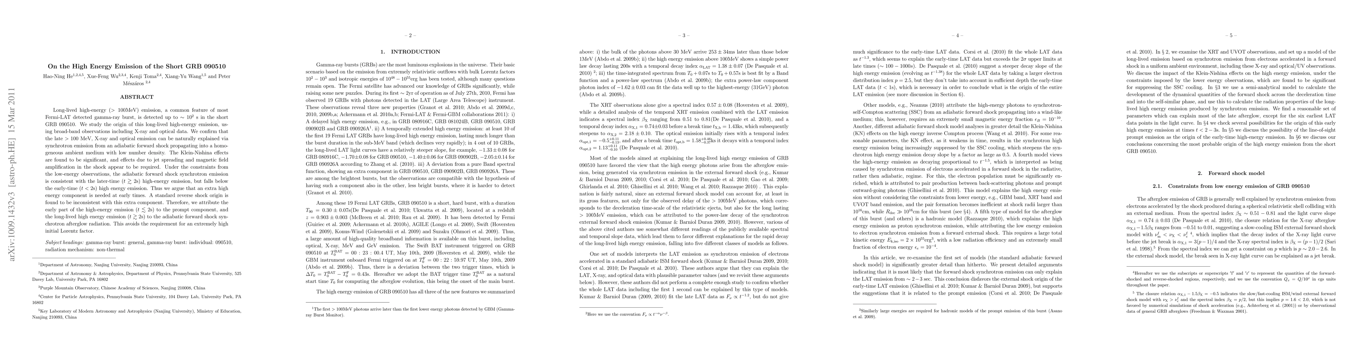 Long-lived high-energy (>100MeV) emission, a common feature of most Fermi-LAT detected gamma-ray burst, is detected up to \sim 10^2 s in the short GRB 090510. We study the origin of this long-lived high-energy emission, using broad-band observations including X-ray and optical data. We confirm that the late > 100 MeV, X-ray and optical emission can be naturally explained via synchrotron emission from an adiabatic forward shock propagating into a homogeneous ambient medium with low number density. The Klein-Nishina effects are found to be significant, and effects due to jet spreading and magnetic field amplification in the shock appear to be required. Under the constraints from the low-energy observations, the adiabatic forward shock synchrotron emission is consistent with the later-time (t>2s) high-energy emission, but falls below the early-time (t < 2s) high energy emission. Thus we argue that an extra high energy component is needed at early times. A standard reverse shock origin is found to be inconsistent with this extra component. Therefore, we attribute the early part of the high-energy emission (t< 2s) to the prompt component, and the long-lived high energy emission (t>2s) to the adiabatic forward shock synchrotron afterglow radiation. This avoids the requirement for an extremely high initial Lorentz factor.