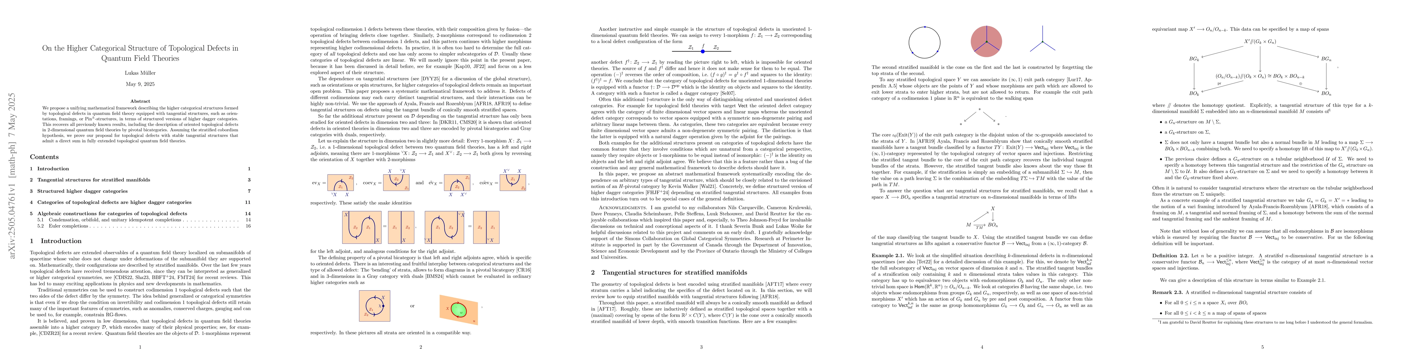 This paper proposes a mathematical framework using higher dagger categories to describe the higher categorical structures of topological defects in quantum field theory, including tangential structures. It proves the framework's validity under the stratified cobordism hypothesis for defects with stable tangential structures.