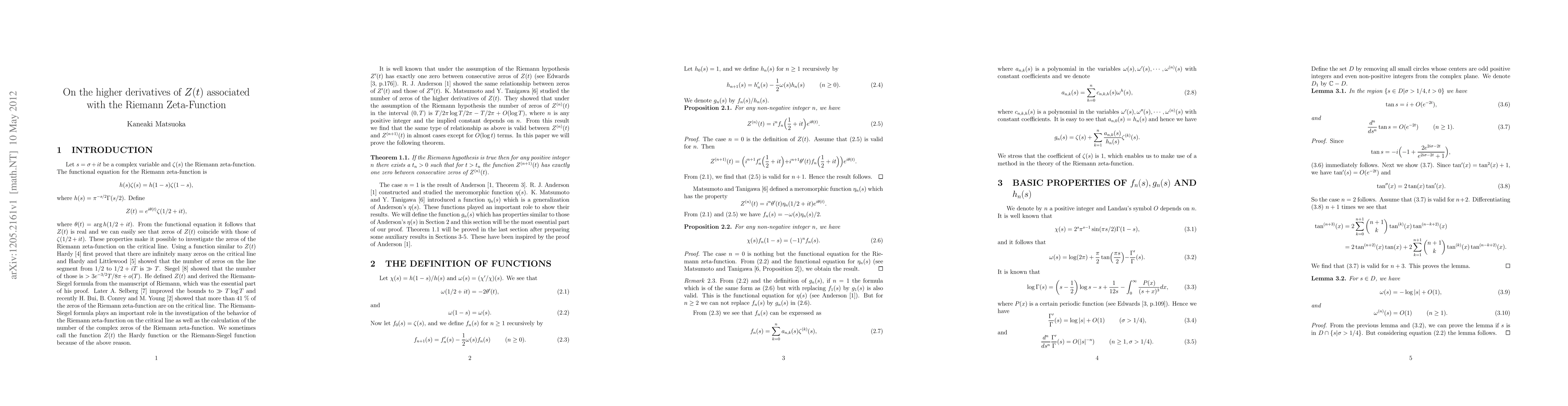 The paper explores the relationship between the higher derivatives of the Hardy function $Z(t)$ associated with the Riemann zeta-function and the zeros of these functions. If the Riemann hypothesis is true, it states that for any positive integer n, there exists a t_n > 0 such that Z^(n+1)(t) has exactly one zero between consecutive zeros of Z^(n)(t).