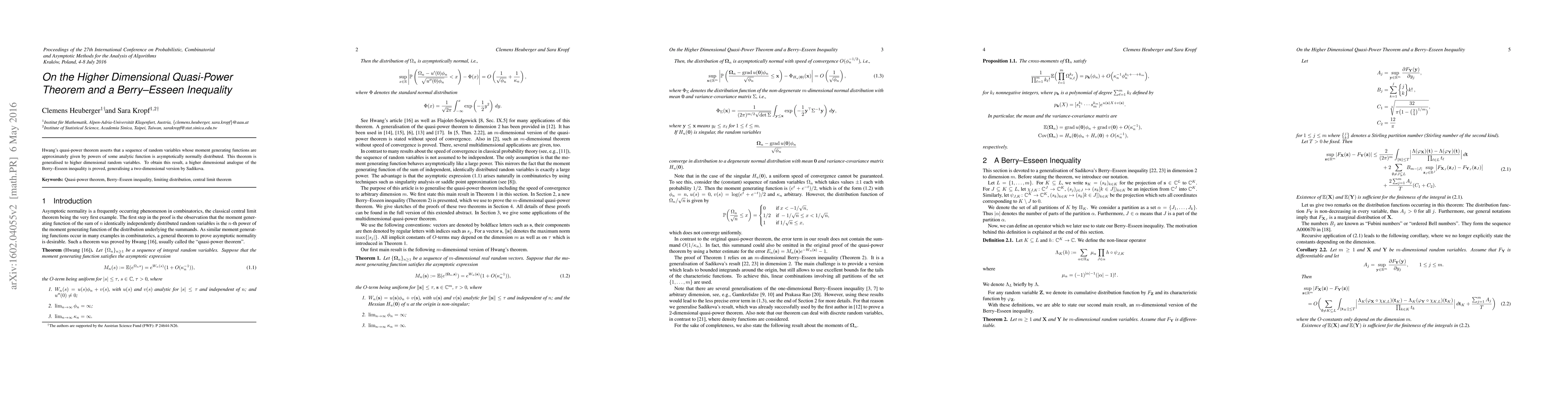 A higher dimensional analogue of the Berry-Esseen inequality is proved to generalize Hwang's quasi-power theorem, showing that sequences of random variables with approximately power-law moments are asymptotically normally distributed.