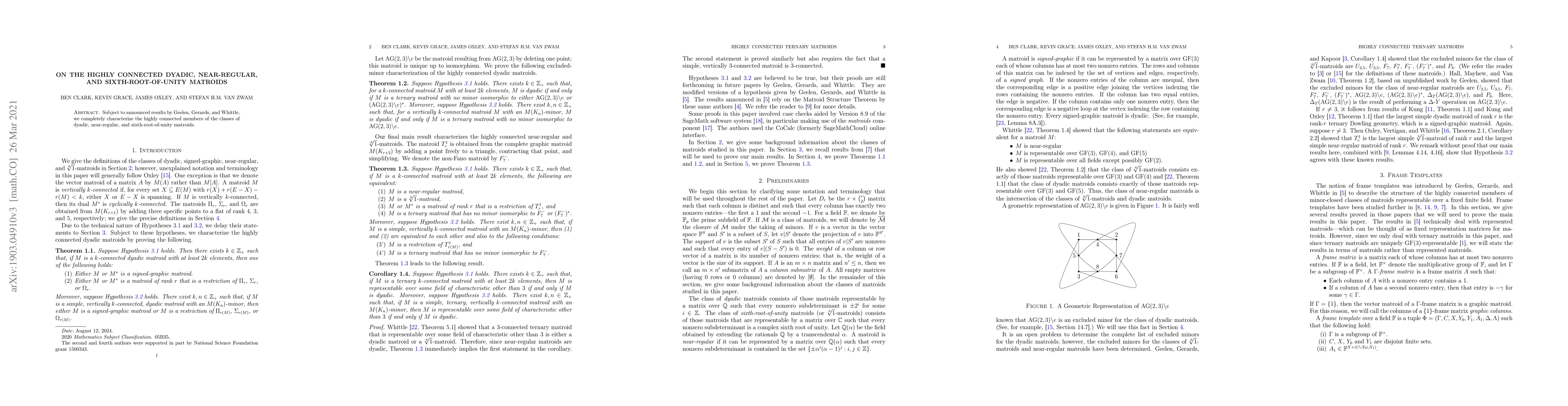 Summary: This paper provides a complete characterization of highly connected dyadic, near-regular, and sixth-root-of-unity matroids based on prior results by Geelen, Gerards, and Whittle. The study focuses on understanding the structural properties of these specific classes of matroids.