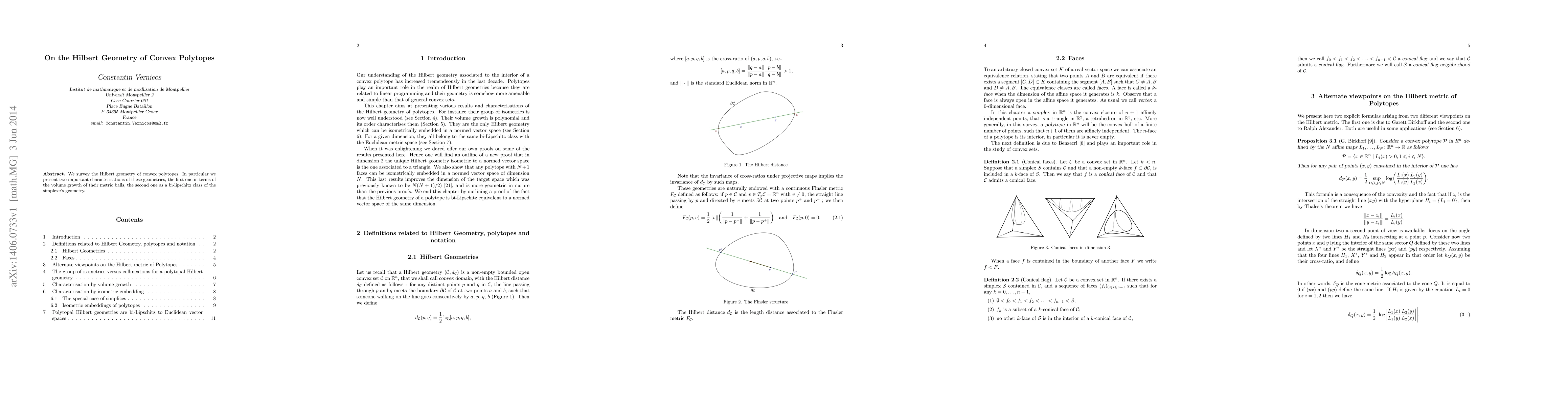 The paper surveys the Hilbert geometry of convex polytopes, presenting two important characterizations: one based on the volume growth of metric balls and another as a bi-Lipschitz class of the simplex's geometry.