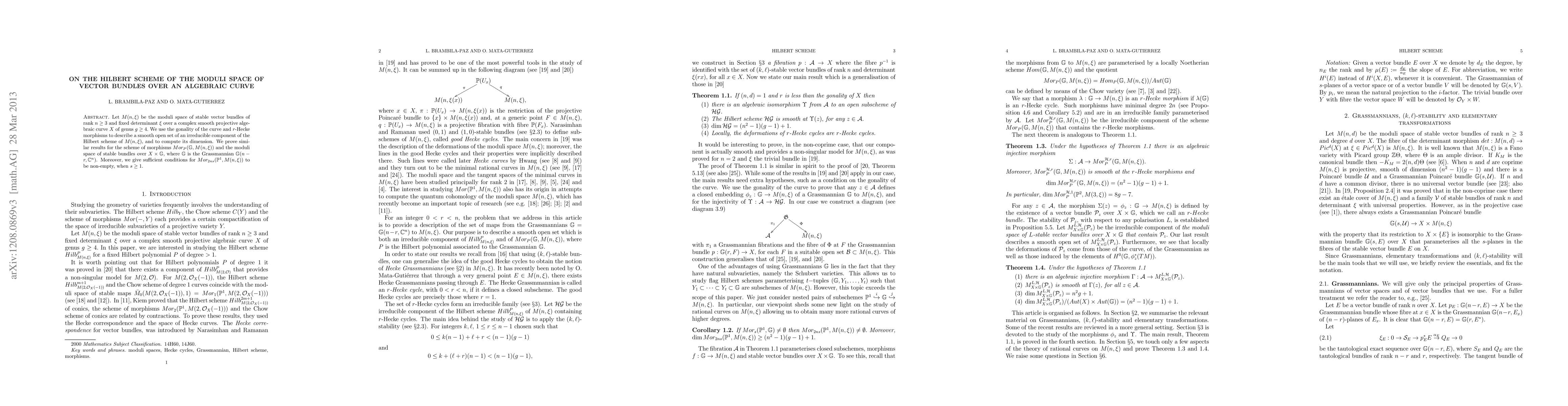 Let $M(n,\xi)$ be the moduli space of stable vector bundles of rank $n\geq 3$ and fixed determinant $\xi$ over a smooth projective algebraic curve $X$ over $\mathbb{C}$ of genus $g\geq 4.$ We use the gonality of the curve and $r$-Hecke morphisms to describe a smooth open set and to compute the dimension of a component of the Hilbert scheme $Hilb_{M(n,\xi)}$, of the scheme of morphisms $Mor(\mathbb{G},M(n,\xi))$ and of the moduli space $ M_{X \times \mathbb{G}}$ of stable bundles over $X\times \mathbb{G},$ where $\mathbb{G}$ is the Grassmannian $\mathbb{G}(n-r,\mathbb{C}^n)$. In particular, we prove that $\dim Mor_P(\mathbb{P}^2,M(3,\xi))=8g-7$ and we give a sufficient condition for $Mor_{2ns}(\mathbb{P}^1,M(n,\xi))$ to be non-empty with $s\geq 1.$