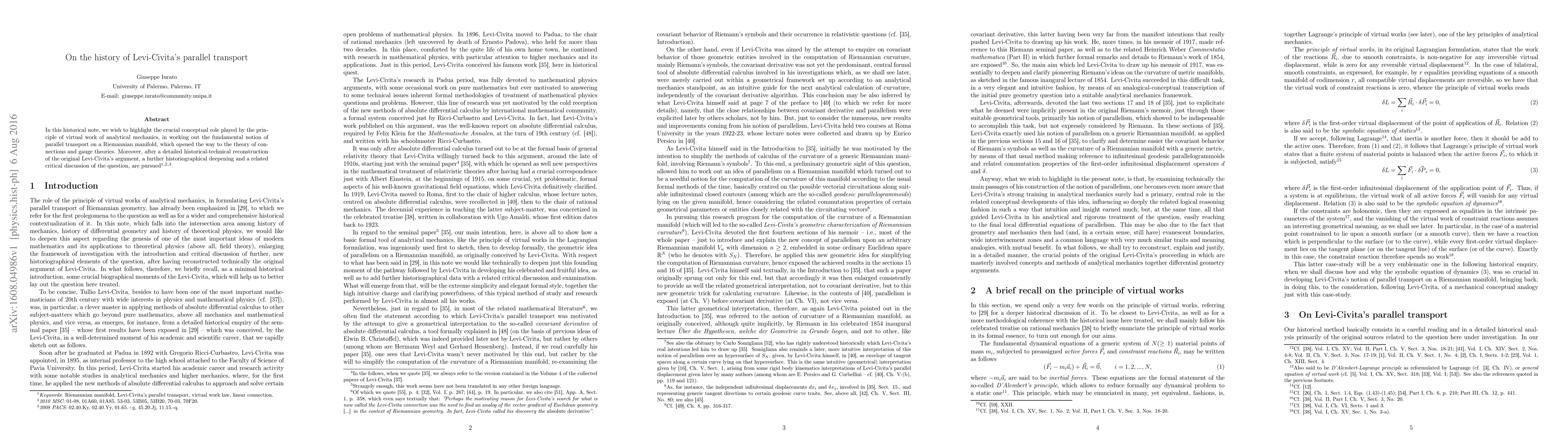 In this historical note, we wish to highlight the crucial conceptual role played by the principle of virtual work of analytical mechanics, in working out the fundamental notion of parallel transport on a Riemannian manifold, which opened the way to the theory of connections and gauge theories. Moreover, after a detailed historical-technical reconstruction of the original Levi-Civita's argument, a further historiographical deepening and a related critical discussion of the question, are pursued.