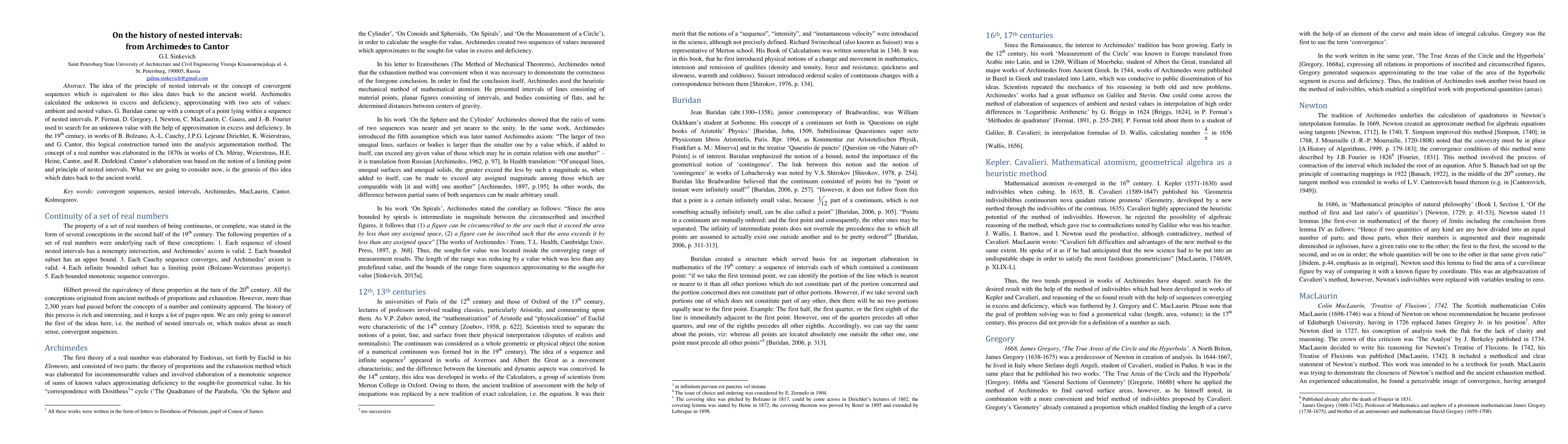 The idea of the principle of nested intervals or the concept of convergent sequences which is equivalent to this idea dates back to the ancient world. Archimedes calculated the unknown in excess and deficiency, approximating with two sets of values: ambient and nested values. Buridan came up with a concept of a point lying within a sequence of nested intervals. Fermat, Gregory, Newton, MacLaurin, Gauss,and Fourier used to search for an unknown value with the help of approximation in excess and deficiency. In the 19-th century, in works of Bolzano, Cauchy, Lejeune Dirichlet, Weierstrass, and Cantor, this logical construction turned into the analysis argumentation method. The concept of a real number was elaborated in the 1870-s in works of Meray, Weierstrass, Heine, Cantor, and Dedekind. Cantor elaboration was based on the notion of a limiting point and principle of nested intervals. What we are going to consider now, is the genesis of this idea which dates back to the ancient world.