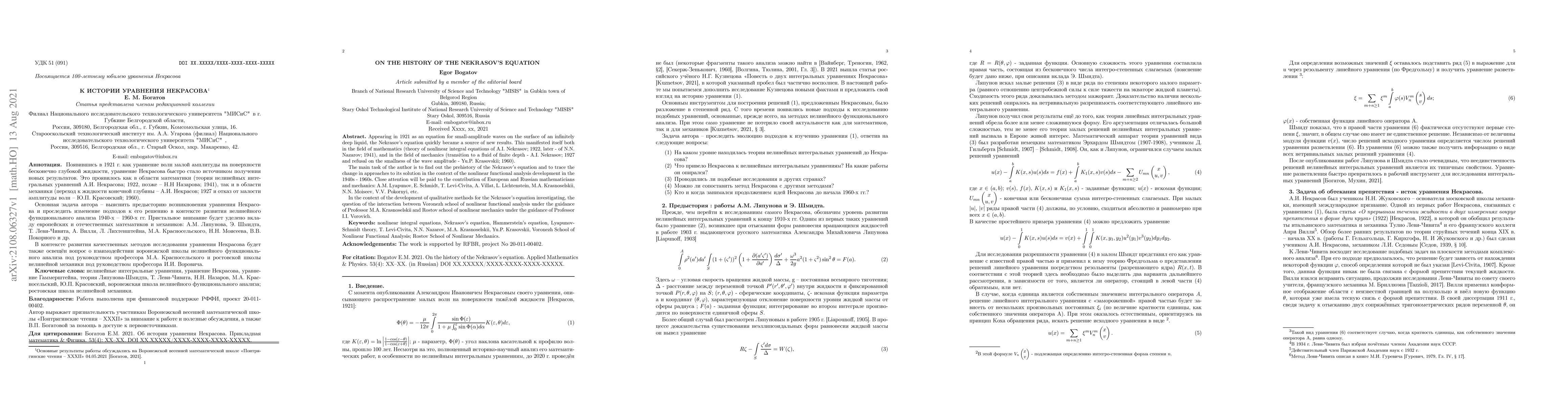 Appearing in 1921 as an equation for small-amplitude waves on the surface of an infinitely deep liquid, the Nekrasov equation quickly became a source of new results. This manifested itself both in the field of mathematics (theory of nonlinear integral equations of A.I. Nekrasov; 1922, later - of N.N. Nazarov; 1941), and in the field of mechanics (transition to a fluid of finite depth - A.I. Nekrasov; 1927 and refusal on the smallness of the wave amplitude - Yu.P. Krasovskii; 1960).The main task of the author is to find out the prehistory of the Nekrasov equation and to trace the change in approaches to its solution in the context of the nonlinear functional analysis development in the 1940s - 1960s. Close attention will be paid to the contribution of European and Russian mathematicians and mechanics: A.M. Lyapunov, E. Schmidt, T. Levi-Civita, A. Villat, L. Lichtenstein, M.A. Krasnoselskii, N.N. Moiseev, V.V. Pokornyi, etc. In the context of the development of qualitative methods for the Nekrasov equation investigating, the question of the interaction between Voronezh school of nonlinear functional analysis under the guidance of Professor M.A. Krasnoselskii and Rostov school of nonlinear mechanics under the guidance of Professor I.I. Vorovich.