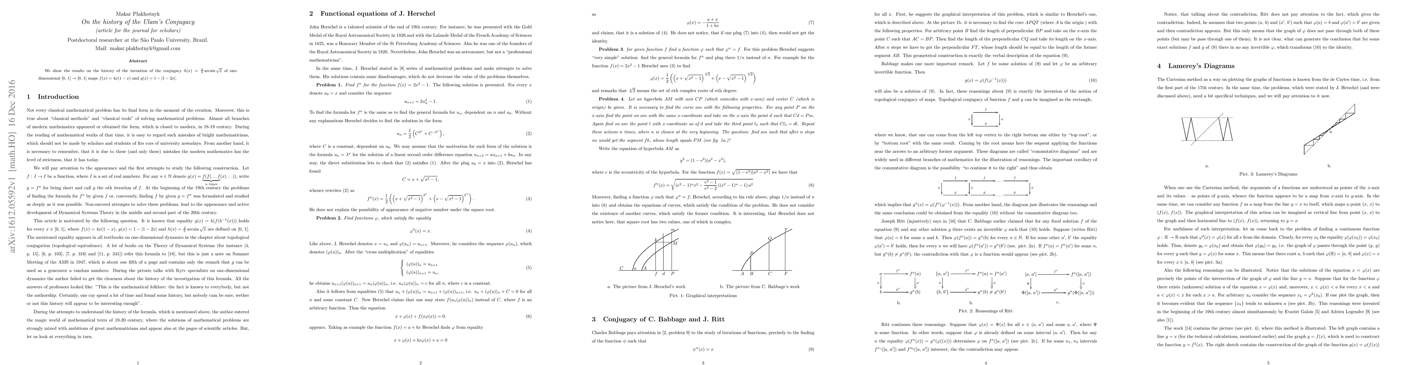 We show the results on the history of the invention of the conjugacy $h(x)=\frac{2}{\pi}\arcsin\sqrt{x}$ of one-dimensional $[0,\, 1]\rightarrow [0,\, 1]$ maps $f(x)=4x(1-x)$ and $g(x)=1-|1-2x|$.
