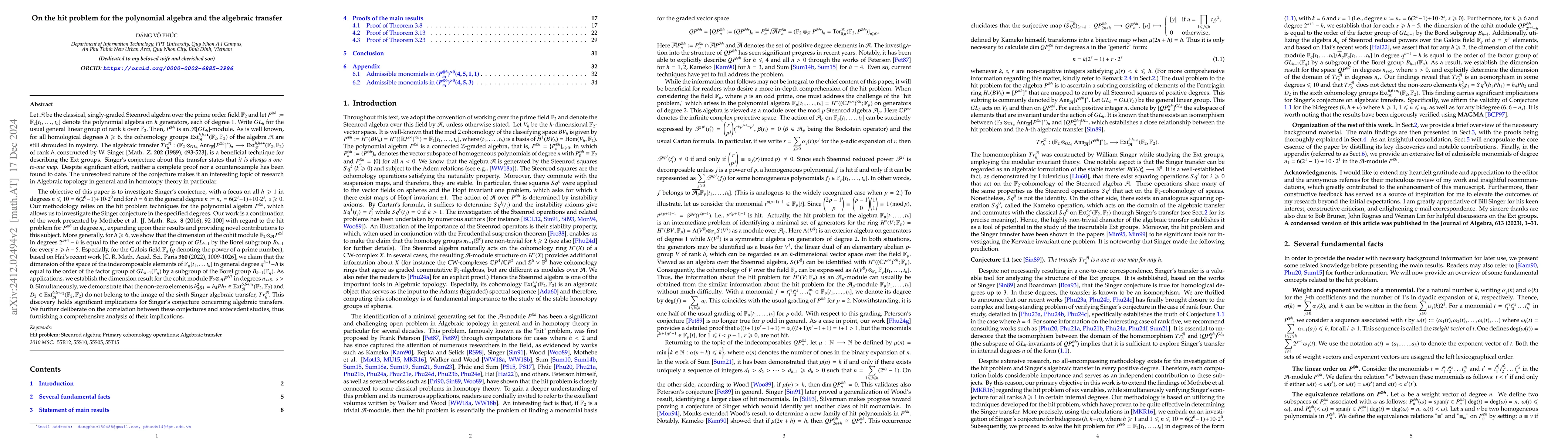 This paper proves Singer's conjecture for $h\geq 6$ by analyzing the cohit module $\mathbb F_2\otimes_{\mathcal A}P^{\otimes h}$ and shows that its dimension corresponds to a specific factor group, while also establishing that certain non-zero elements are not in the image of the Singer algebraic transfer.