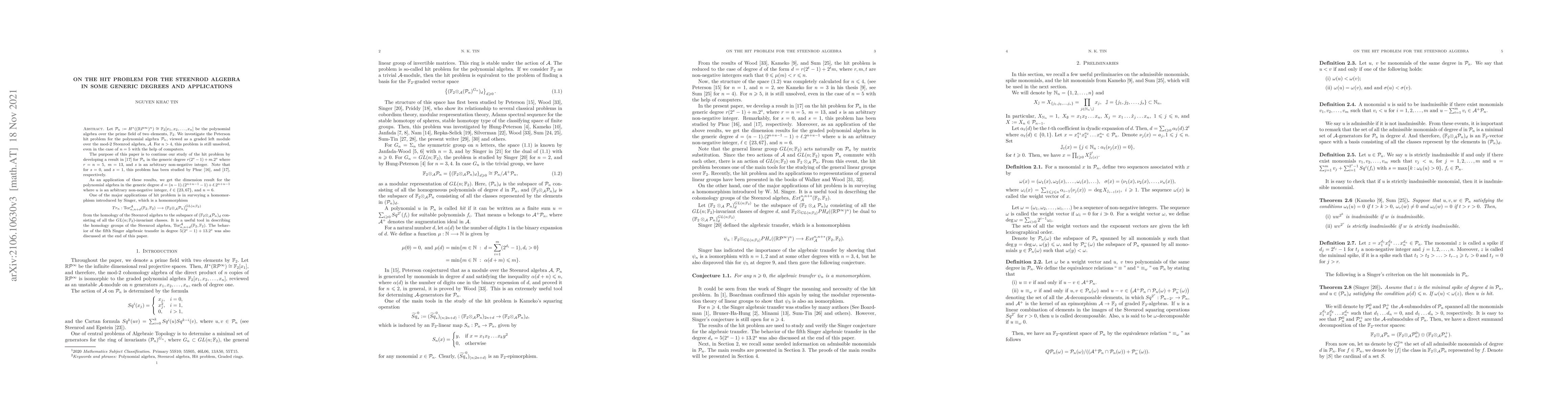 Let $\mathcal P_{n}:=H^{*}((\mathbb{R}P^{\infty})^{n}) \cong \mathbb F_2[x_{1},x_{2},\ldots,x_{n}]$ be the polynomial algebra over the prime field of two elements, $\mathbb F_2.$ We investigate the Peterson hit problem for the polynomial algebra $\mathcal P_{n},$ viewed as a graded left module over the mod-$2$ Steenrod algebra, $\mathcal{A}.$ For $n>4,$ this problem is still unsolved, even in the case of $n=5$ with the help of computers. The purpose of this paper is to continue our study of the hit problem by developing a result in \cite{ph31} for $\mathcal P_n$ in the generic degree $r(2^s-1)+m.2^s$ where $r=n=5,\ m=13,$ and $s$ is an arbitrary non-negative integer. Note that for $s=0,$ and $s=1,$ this problem has been studied by Phuc \cite{ph20ta}, and \cite{ph31}, respectively. As an application of these results, we get the dimension result for the polynomial algebra in the generic degree $d=(n-1).(2^{n+u-1}-1)+\ell.2^{n+u-1}$ where $u$ is an arbitrary non-negative integer, $\ell \in \{23, 67 \},$ and $n=6.$ One of the major applications of hit problem is in surveying a homomorphism introduced by Singer, which is a homomorphism $$Tr_n :\text{Tor}^{\mathcal A}_{n, n+d} (\mathbb F_2,\mathbb F_2) \longrightarrow (\mathbb{F}_{2}{\otimes}_{\mathcal{A}}\mathcal P_{n})_d^{GL(n; \mathbb F_2)}$$ from the homology of the Steenrod algebra to the subspace of $(\mathbb{F}_{2}{\otimes}_{\mathcal{A}}\mathcal P_{n})_d$ consisting of all the $GL(n; \mathbb F_2)$-invariant classes. It is a useful tool in describing the homology groups of the Steenrod algebra, $\text{Tor}^{\mathcal A}_{n, n+d}(\mathbb F_2,\mathbb F_2).$ The behavior of the fifth Singer algebraic transfer in degree $5(2^s-1)+13.2^s$ was also discussed at the end of this paper.