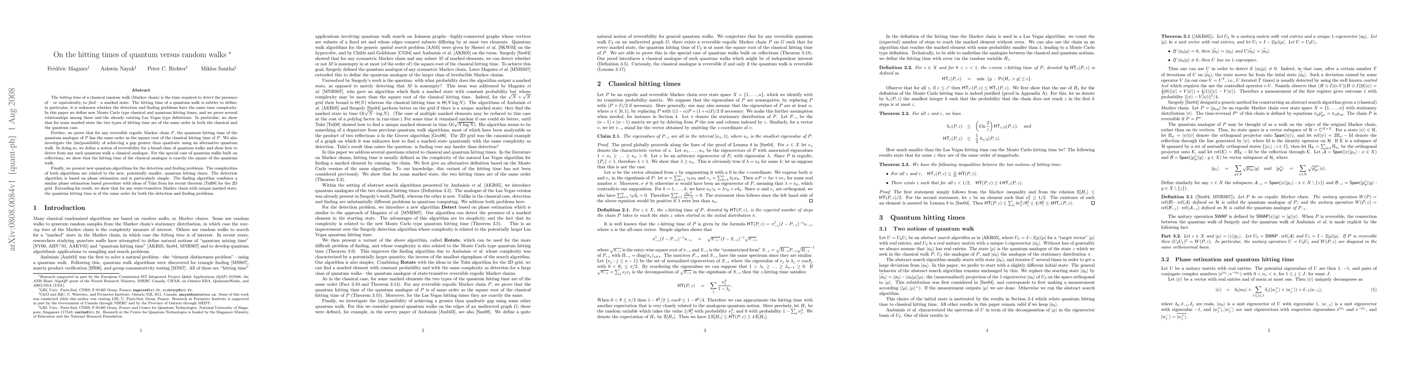 This paper introduces new classical and quantum hitting time definitions, proving their order equivalence for certain marked states in both classical and quantum walks. It also shows that quantum hitting time for a quantum analogue of a reversible ergodic Markov chain is the square root of the classical hitting time's order. The research further presents quantum algorithms for detection and finding problems, linking their complexities to these new hitting times, and extends Tulsi's theorem for state-transitive Markov chains with unique marked states.