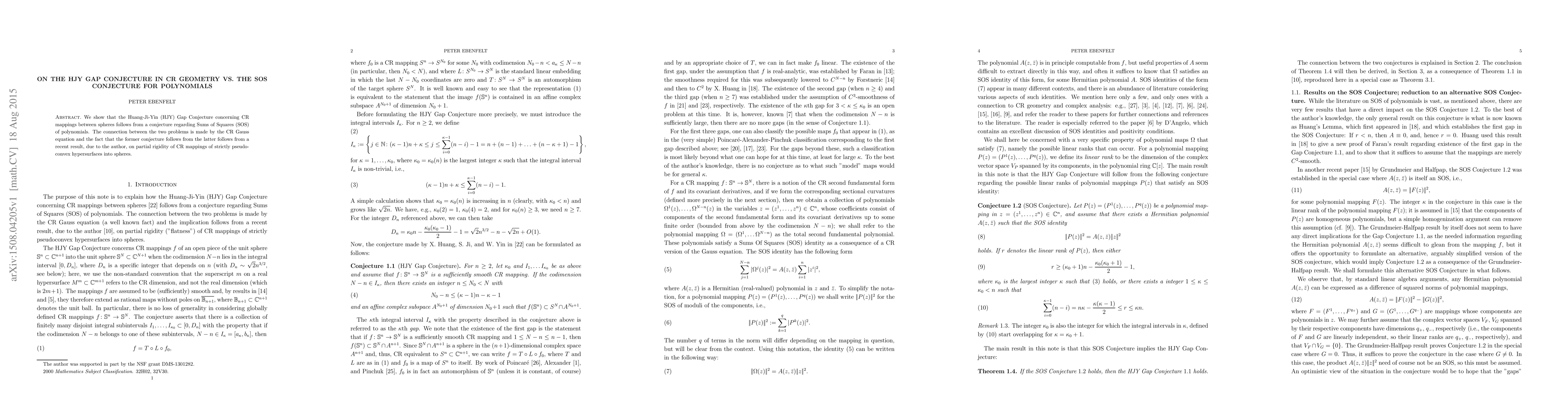 We show that the Huang-Ji-Yin (HJY) Gap Conjecture concerning CR mappings between spheres follows from a conjecture regarding Sums of Squares (SOS) of polynomials. The connection between the two problems is made by the CR Gauss equation and the fact that the former conjecture follows from the latter follows from a recent result, due to the author, on partial rigidity of CR mappings of strictly pseudoconvex hypersurfaces into spheres.