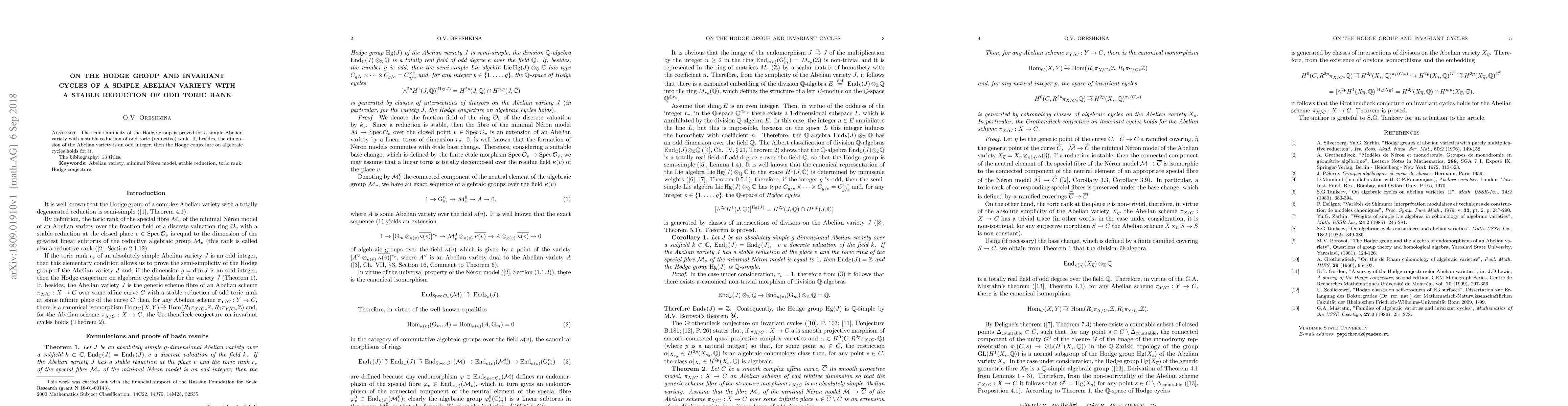 Summary: The paper proves the semi-simplicity of the Hodge group for simple Abelian varieties with stable reductions of odd toric rank, and establishes the validity of the Hodge conjecture for algebraic cycles in such varieties when their dimension is also an odd integer.