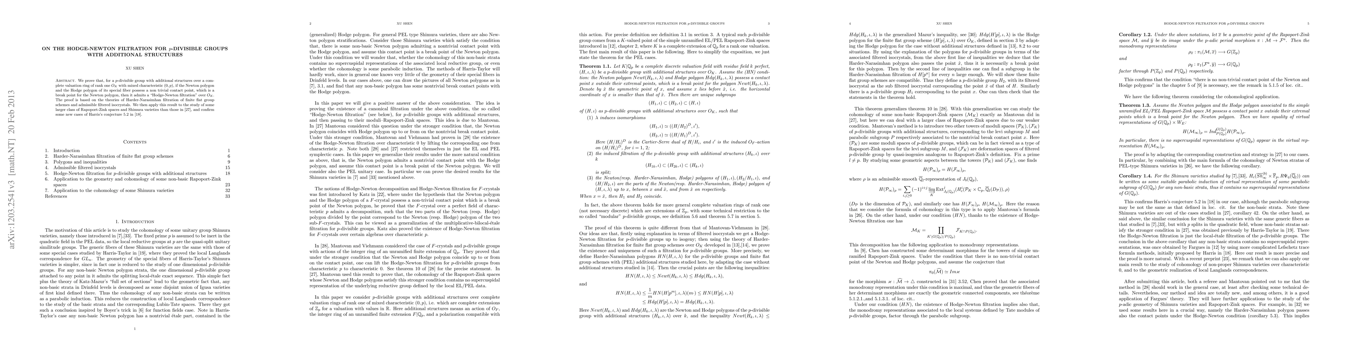 We prove that, for a $p$-divisible group with additional structures over a complete valuation ring of rank one $O_K$ with mixed characteristic $(0,p)$, if the Newton polygon and the Hodge polygon of its special fiber possess a non trivial contact point, which is a break point for the Newton polygon, then it admits a "Hodge-Newton filtration" over $O_K$. The proof is based on the theories of Harder-Narasimhan filtration of finite flat group schemes and admissible filtered isocrystals. We then apply this result to the study of some larger class of Rapoport-Zink spaces and Shimura varieties than those studied previously by Mantovan, and confirm some new cases of Harris's conjecture.