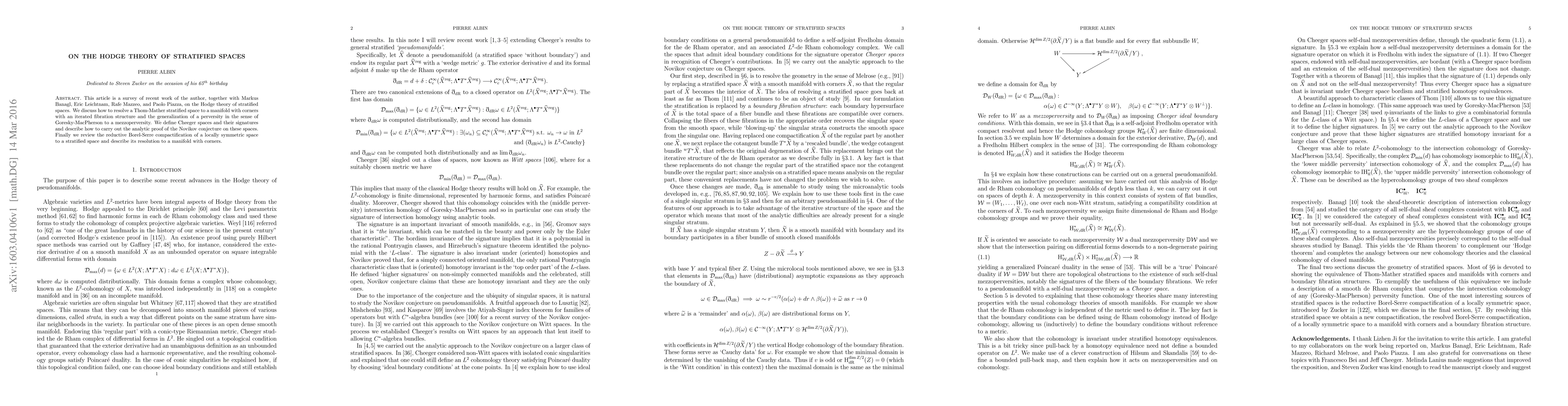 This article is a survey of recent work of the author, together with Markus Banagl, Eric Leichtnam, Rafe Mazzeo, and Paolo Piazza, on the Hodge theory of stratified spaces. We discuss how to resolve a Thom-Mather stratified space to a manifold with corners with an iterated fibration structure and the generalization of a perversity in the sense of Goresky-MacPherson to a mezzoperversity. We define Cheeger spaces and their signatures and describe how to carry out the analytic proof of the Novikov conjecture on these spaces. Finally we review the reductive Borel-Serre compactification of a locally symmetric space to a stratified space and describe its resolution to a manifold with corners.