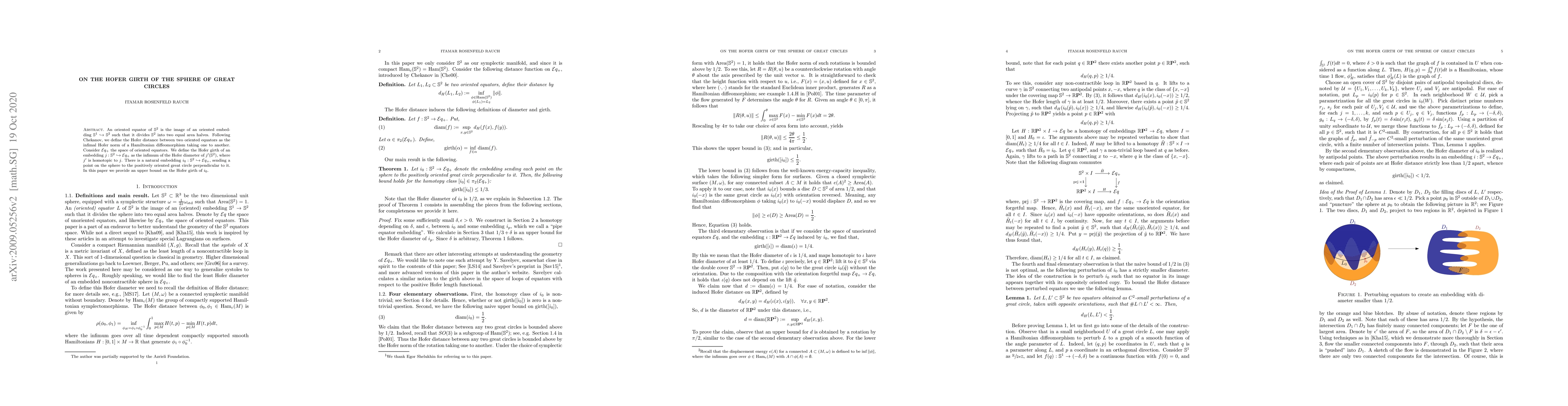 An oriented equator of $\mathbb{S}^2$ is the image of an oriented embedding $\mathbb{S}^1 \hookrightarrow \mathbb{S}^2$ such that it divides $\mathbb{S}^2$ into two equal area halves. Following Chekanov, we define the Hofer distance between two oriented equators as the infimal Hofer norm of a Hamiltonian diffeomorphism taking one to another. Consider $\mathcal{E}q_+$ the space of oriented equators. We define the Hofer girth of an embedding $j:\mathbb{S}^2 \hookrightarrow \mathcal{E}q_+$ as the infimum of the Hofer diameter of $j'(\mathbb{S}^2)$, where $j'$ is homotopic to $j$. There is a natural embedding $i_0:\mathbb{S}^2\hookrightarrow\mathcal{E}q_+$, sending a point on the sphere to the positively oriented great circle perpendicular to it. In this paper we provide an upper bound on the Hofer girth of $i_0$.
