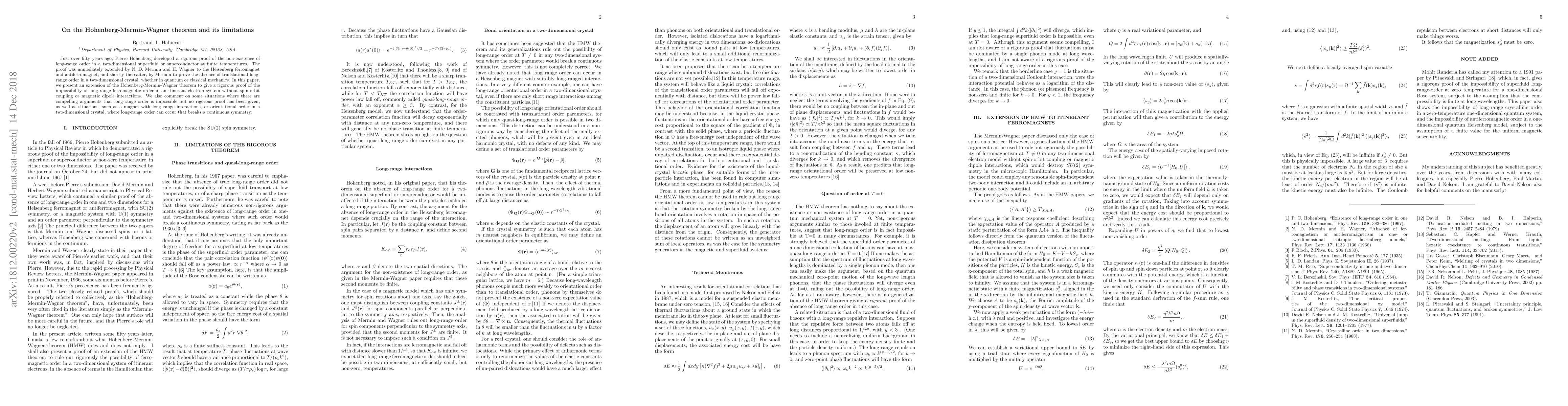 This paper extends the Hohenberg-Mermin-Wagner theorem to demonstrate the impossibility of long-range ferromagnetic order in two-dimensional itinerant electron systems without spin-orbit coupling or magnetic dipole interactions. It also discusses scenarios where long-range order is theoretically impossible but lacks rigorous proof, as well as cases where it can occur, such as in magnets with long-range interactions or orientational order in crystals.