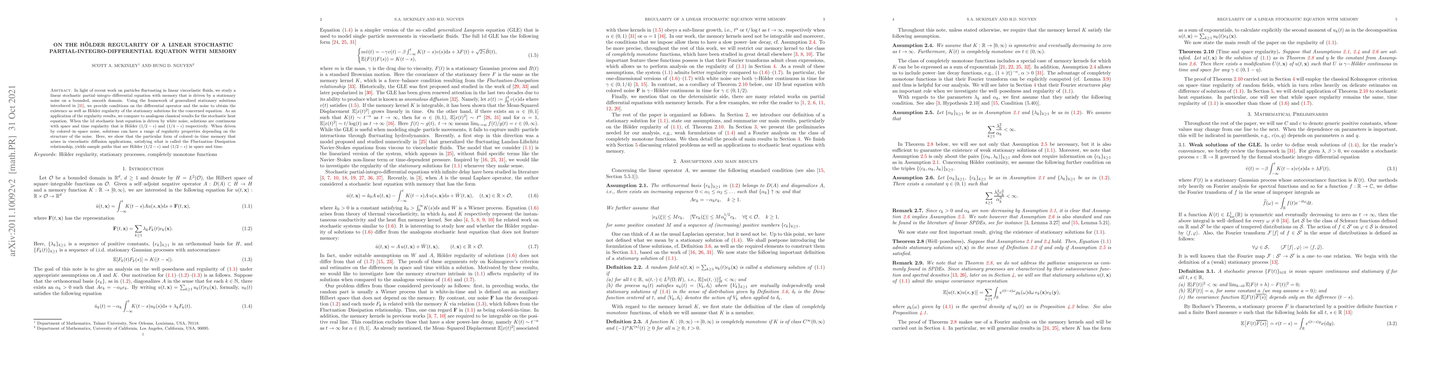 In light of recent work on particles fluctuating in linear viscoelastic fluids, we study a linear stochastic partial-integro-differential equation with memory that is driven by a stationary noise on a bounded, smooth domain. Using the framework of generalized stationary solutions introduced in~\cite{mckinley2018anomalous}, we provide sufficient conditions on the differential operator and the noise to obtain the existence as well as H\"older regularity of the stationary solutions for the concerned equation. As an application of the regularity results, we compare to analogous classical results for the stochastic heat equation. When the 1d stochastic heat equation is driven by white noise, solutions are continuous with space and time regularity that is H\"older $(1/2-\ep)$ and $(1/4-\ep)$ respectively. When driven by colored-in-space noise, solutions can have a range of regularity properties depending on the structure of the noise. Here, we show that the particular form of colored-in-time memory that arises in viscoelastic diffusion applications, satisfying what is called the Fluctuation--Dissipation relationship, yields sample paths that are H\"older $(1/2-\ep)$ and $(1/2-\ep)$ in space and time.