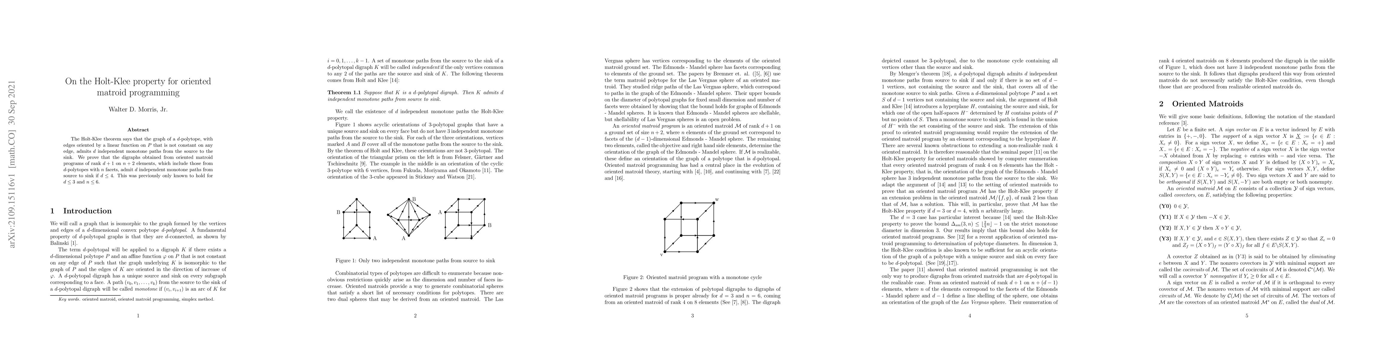 The Holt-Klee theorem says that the graph of a $d$-polytope, with edges oriented by a linear function on $P$ that is not constant on any edge, admits $d$ independent monotone paths from the source to the sink. We prove that the digraphs obtained from oriented matroid programs of rank $d+1$ on $n+2$ elements, which include those from $d$-polytopes with $n$ facets, admit $d$ independent monotone paths from source to sink if $d \le 4$. This was previously only known to hold for $d\le 3$ and $n\le 6$.