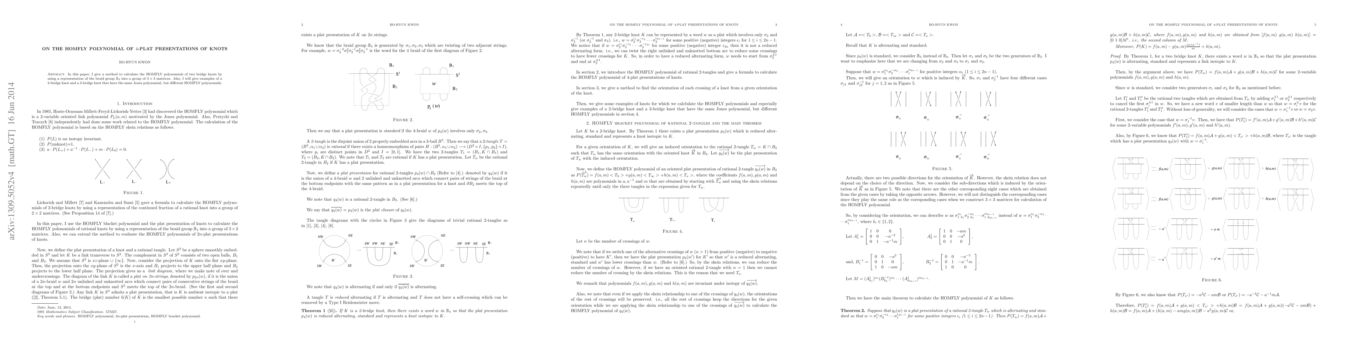 In this paper, I give a method to calculate the HOMFLY polynomials of knots by using a representation of the braid group B4 into a group of 3 ? 3 matrices. Also, I will give examples of a 2-bridge knot and a 3-bridge knot that have the same Jone polynomial, but different HOMFLY polynomials.
