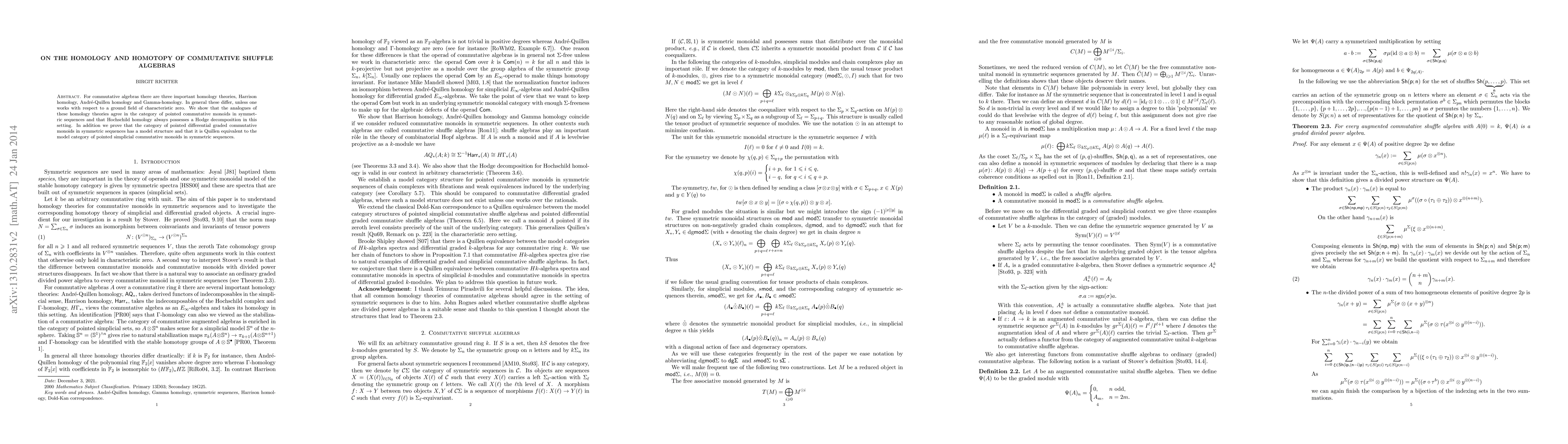 This paper establishes that, within the context of pointed commutative monoids in symmetric sequences, various homology theories (Harrison, Andre-Quillen, and Gamma) coincide, and Hochschild homology exhibits a Hodge decomposition. It also demonstrates a Quillen equivalence between differential graded commutative monoids and simplicial commutative monoids in symmetric sequences.