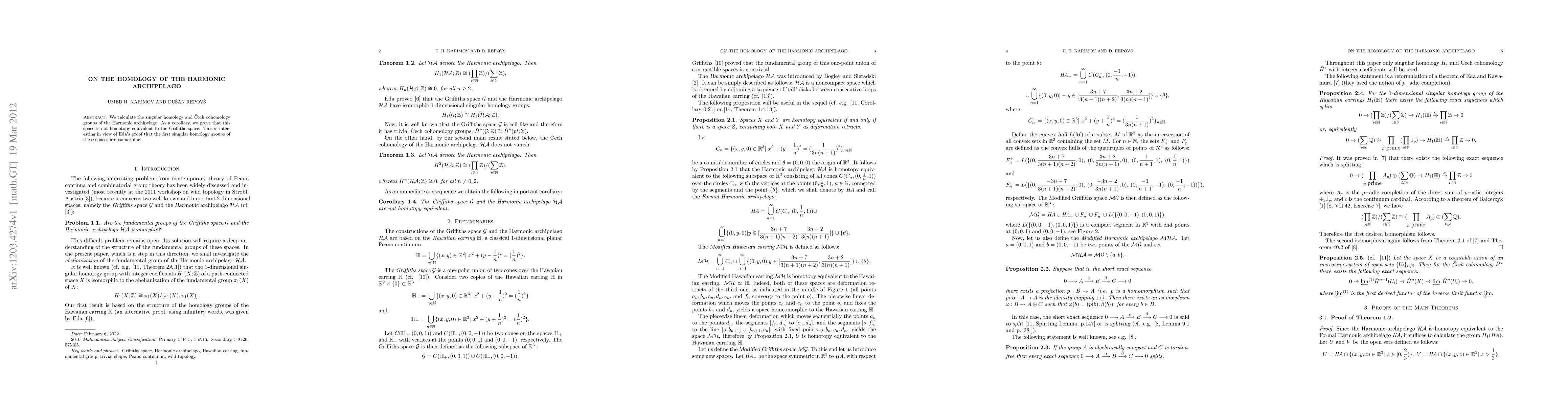 The paper calculates the singular homology and \v{C}ech cohomology groups of the Harmonic Archipelago, demonstrating it is not homotopy equivalent to the Griffiths space despite Eda's proof of isomorphic first singular homology groups between the two.