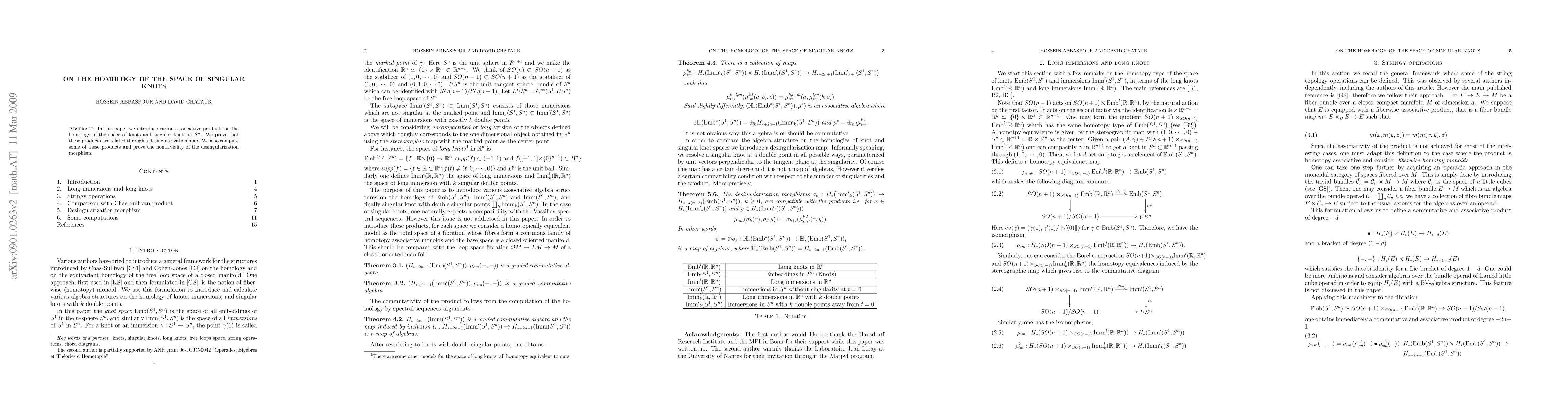 This paper introduces associative products on the homology of spaces of knots and singular knots in $S^n$, demonstrating their interrelation via a desingularization map, and proves the nontriviality of this morphism.