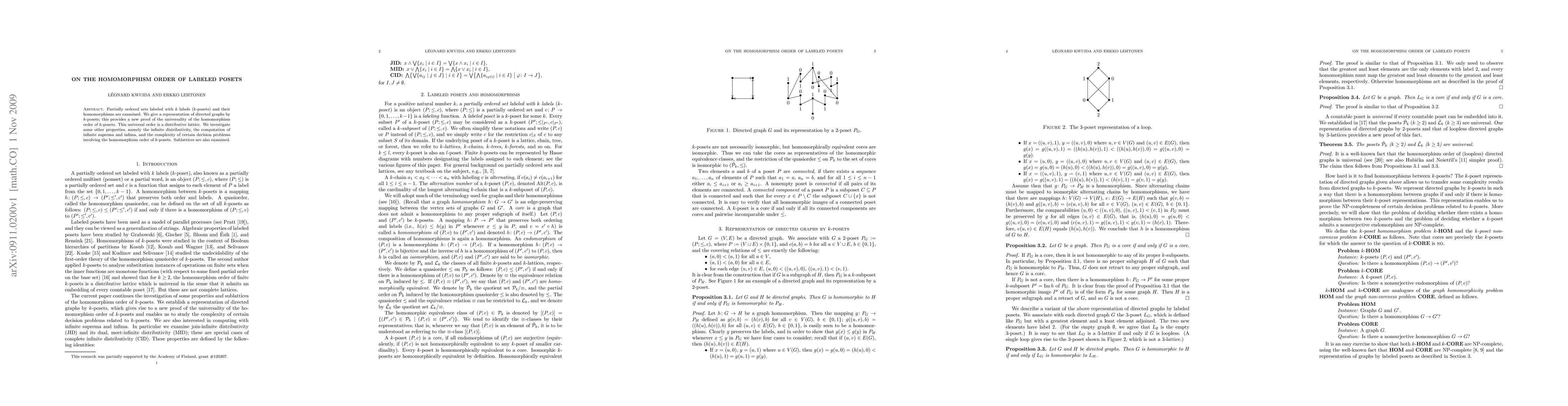 Partially ordered sets labeled with k labels (k-posets) and their homomorphisms are examined. We give a representation of directed graphs by k-posets; this provides a new proof of the universality of the homomorphism order of k-posets. This universal order is a distributive lattice. We investigate some other properties, namely the infinite distributivity, the computation of infinite suprema and infima, and the complexity of certain decision problems involving the homomorphism order of k-posets. Sublattices are also examined.