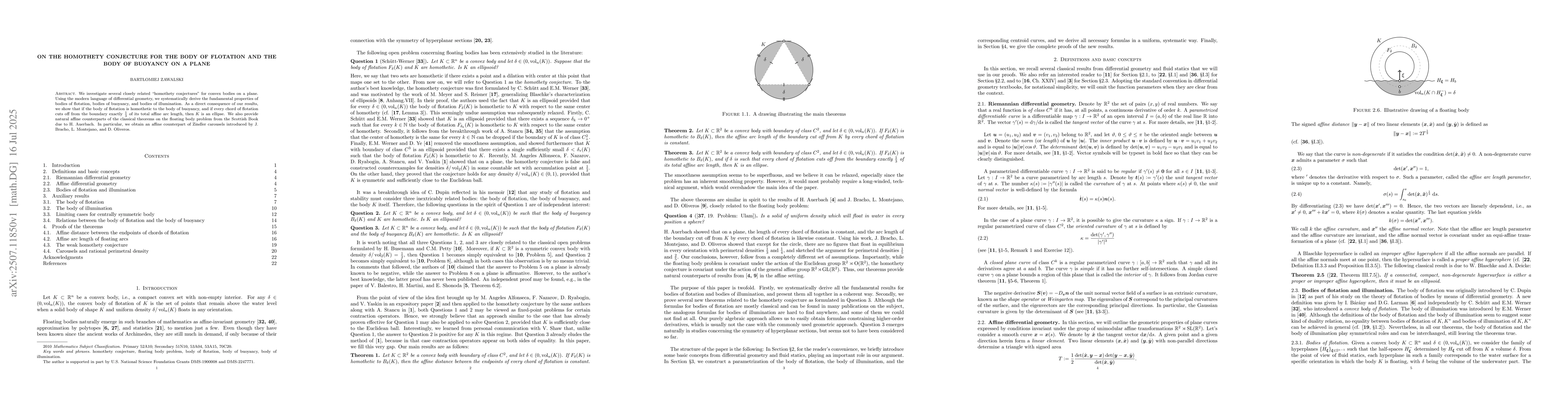 We investigate several closely related "homothety conjectures" for convex bodies on a plane. Using the modern language of differential geometry, we systematically derive the fundamental properties of bodies of flotation, bodies of buoyancy, and bodies of illumination. As a direct consequence of our results, we show that if the body of flotation is homothetic to the body of buoyancy, and if every chord of flotation cuts off from the boundary exactly $\frac{1}{3}$ of its total affine arc length, then $K$ is an ellipse. We also provide natural affine counterparts of the classical theorems on the floating body problem from the Scottish Book due to H. Auerbach. In particular, we obtain an affine counterpart of Zindler carousels introduced by J. Bracho, L. Montejano, and D. Oliveros.