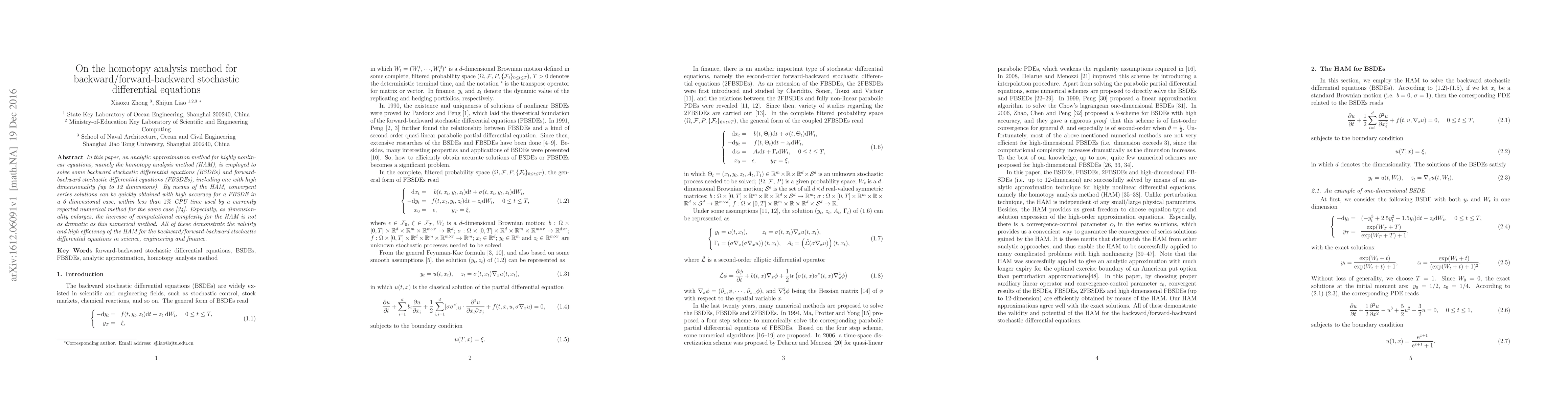 In this paper, an analytic approximation method for highly nonlinear equations, namely the homotopy analysis method (HAM), is employed to solve some backward stochastic differential equations (BSDEs) and forward-backward stochastic differential equations (FBSDEs), including one with high dimensionality (up to 12 dimensions). By means of the HAM, convergent series solutions can be quickly obtained with high accuracy for a FBSDE in a 6 dimensional case, within less than $1\%$ CPU time used by a currently reported numerical method for the same case [34]. Especially, as dimensionality enlarges, the increase of computational complexity for the HAM is not as dramatic as this numerical method. All of these demonstrate the validity and high efficiency of the HAM for the backward/forward-backward stochastic differential equations in science, engineering and finance.