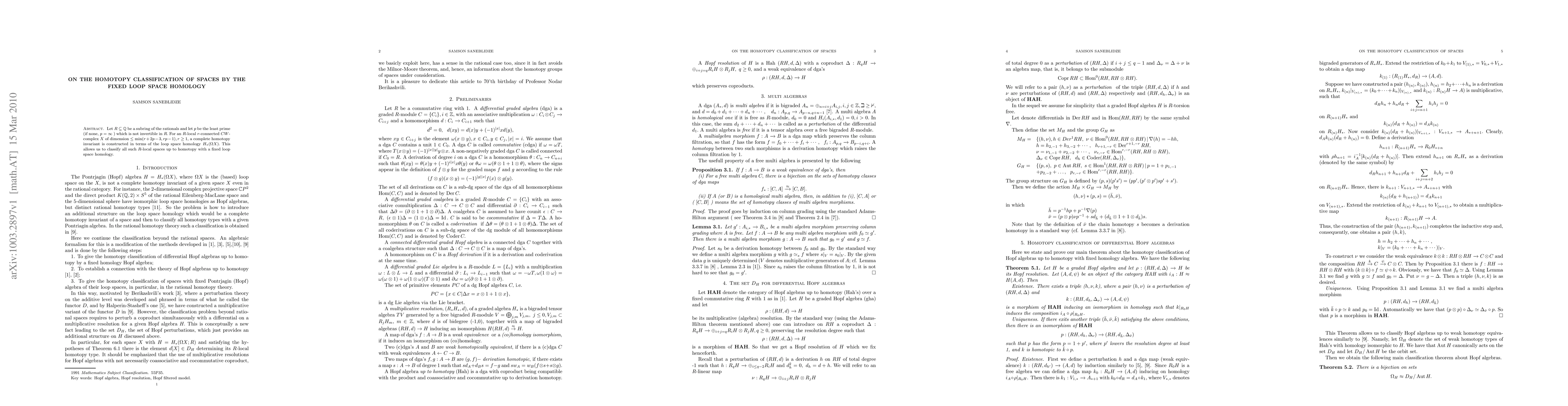 Researchers developed a homotopy invariant to classify spaces up to homotopy with a fixed loop space homology, allowing for the classification of R-local r-connected CW complexes.