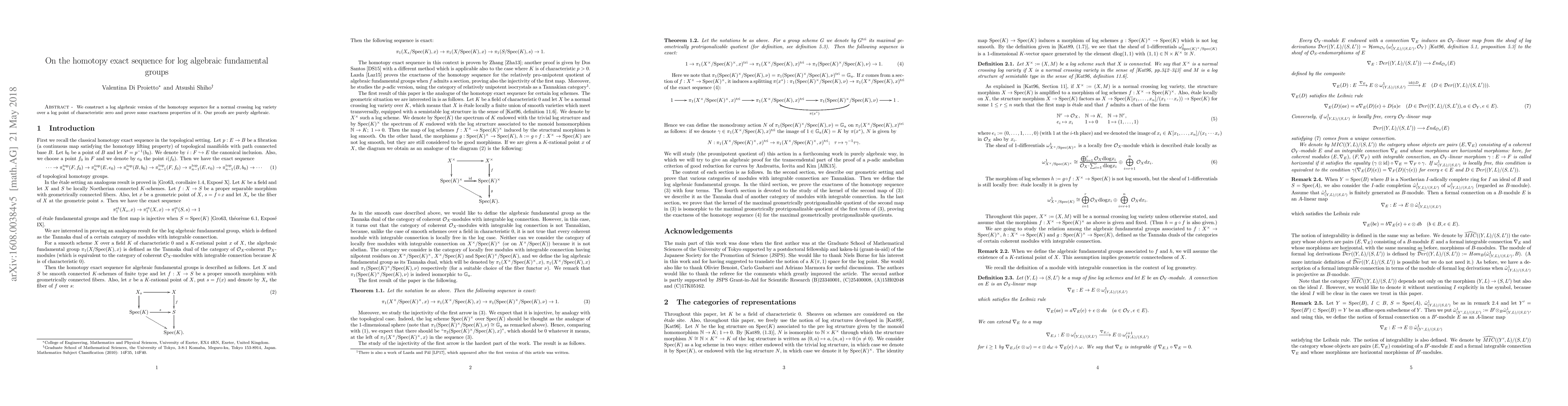 This paper constructs a log algebraic homotopy sequence for quasi-projective normal crossing log varieties over a log point in characteristic zero and proves its exactness properties through purely algebraic methods. The work advances the understanding of fundamental groups in the context of log algebraic geometry.