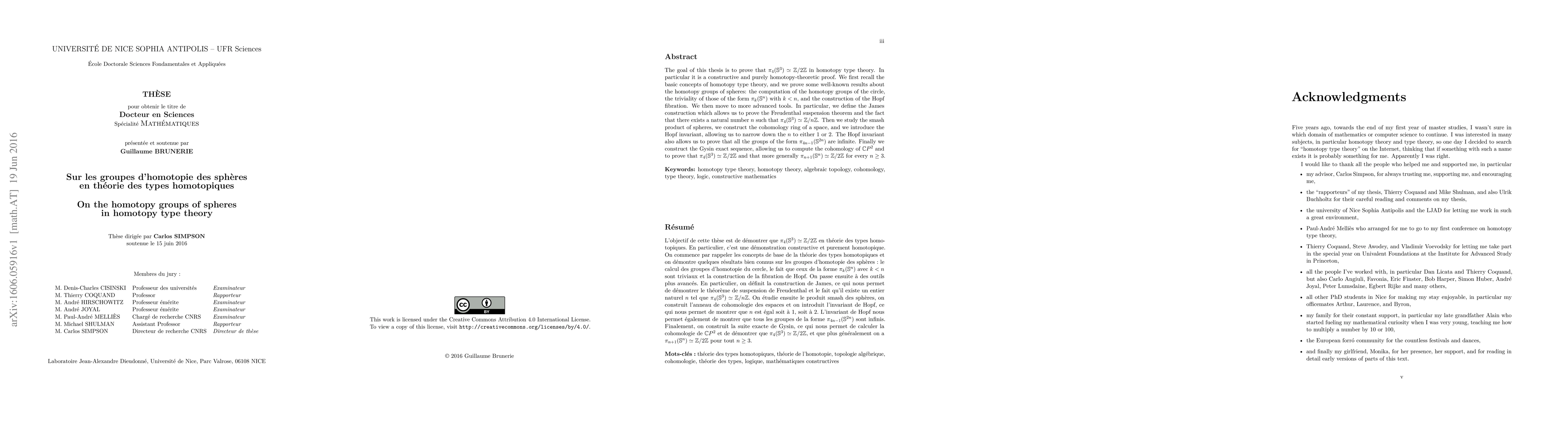 This thesis provides a constructive proof in homotopy type theory that $\pi_4(S^3) \simeq \mathbb{Z}/2\mathbb{Z}$, utilizing advanced tools like the James construction and Hopf invariant, and establishes that $\pi_{n+1}(S^n) \simeq \mathbb{Z}/2\mathbb{Z}$ for $n \ge 3$.