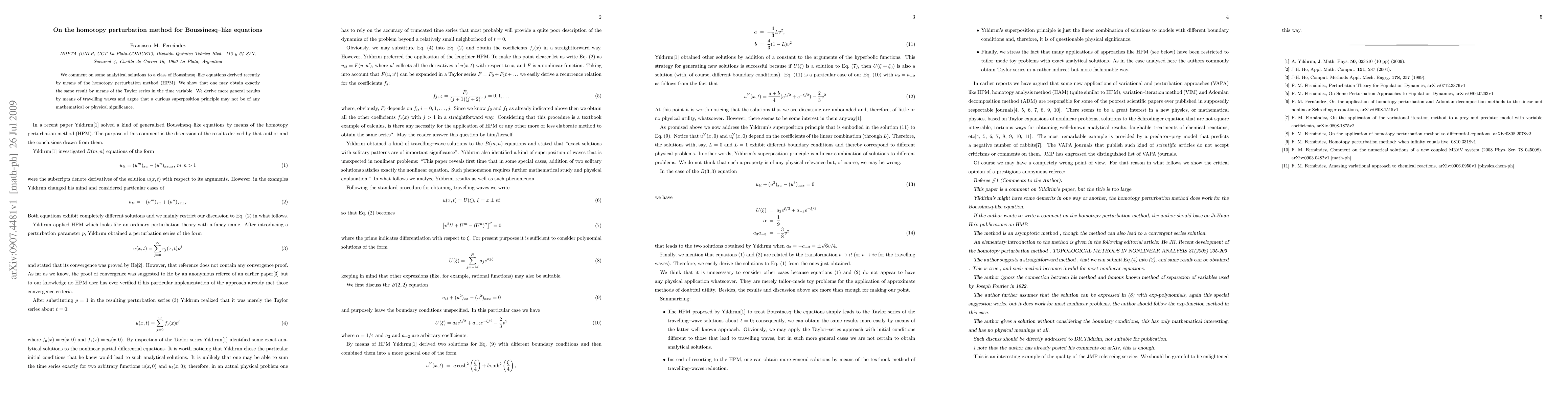 We comment on some analytical solutions to a class of Boussinesq-like equations derived recently by means of the homotopy perturbation method (HPM). We show that one may obtain exactly the same result by means of the Taylor series in the time variable. We derive more general results by means of travelling waves and argue that a curious superposition principle may not be of any mathematical or physical significance.
