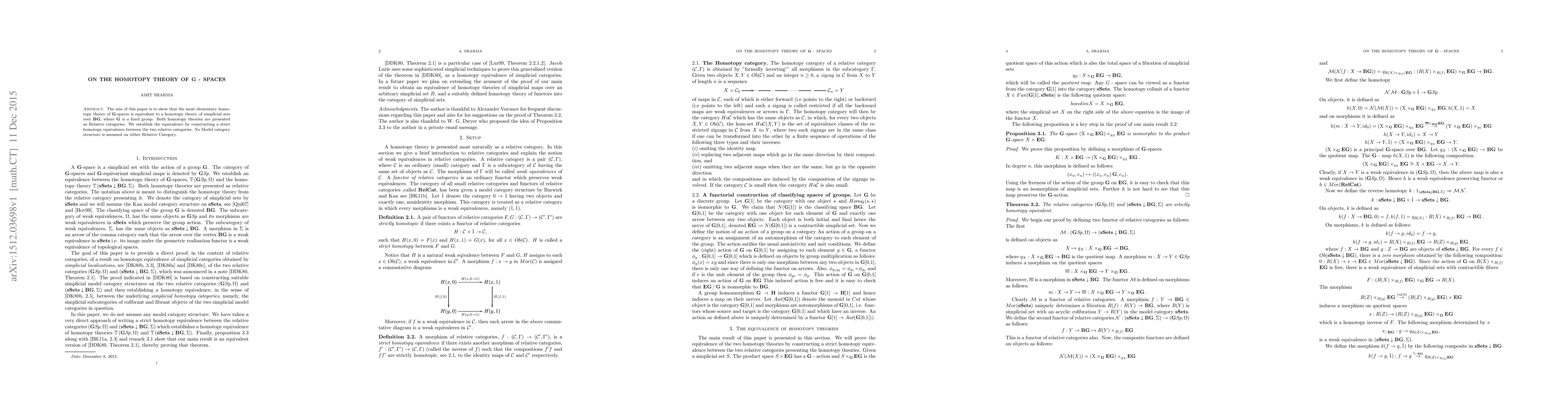 The aim of this paper is to show that the most elementary homotopy theory of $\mathbf{G}$-spaces is equivalent to a homotopy theory of simplicial sets over $\mathbf{BG}$, where $\mathbf{G}$ is a fixed group. Both homotopy theories are presented as Relative categories. We establish the equivalence by constructing a strict homotopy equivalence between the two relative categories. No Model category structure is assumed on either Relative Category.