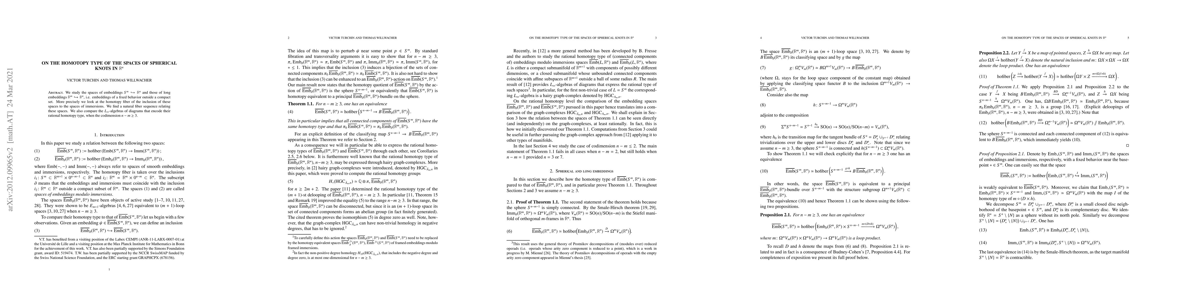 We study the spaces of embeddings $S^m\hookrightarrow R^n$ and those of long embeddings $R^m\hookrightarrow R^n$, i.e. embeddings of a fixed behavior outside a compact set. More precisely we look at the homotopy fiber of the inclusion of these spaces to the spaces of immersions. We find a natural fiber sequence relating these spaces. We also compare the $L_\infty$-algebras of diagrams that encode their rational homotopy type, when the codimension $n-m\geq 3$.