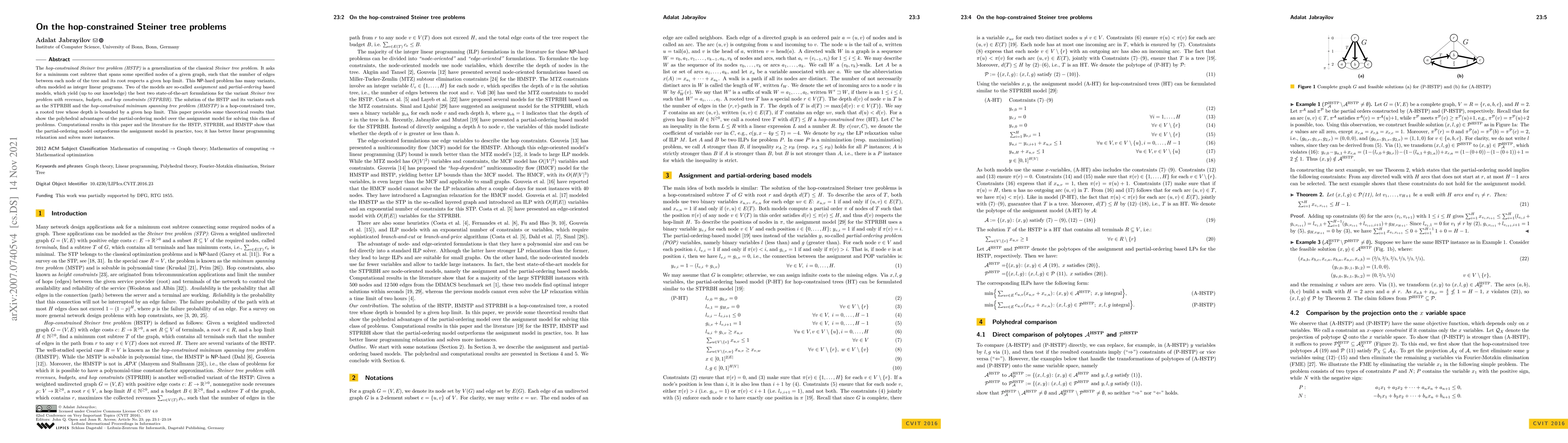 The hop-constrained Steiner tree problem (HSTP) seeks a minimum-cost subtree spanning specified nodes while respecting hop limits between nodes and the root. The paper compares two state-of-the-art formulations, showing that the partial-ordering model offers better theoretical and practical performance than the assignment model, evidenced by stronger linear programming relaxations and higher solvability rates.